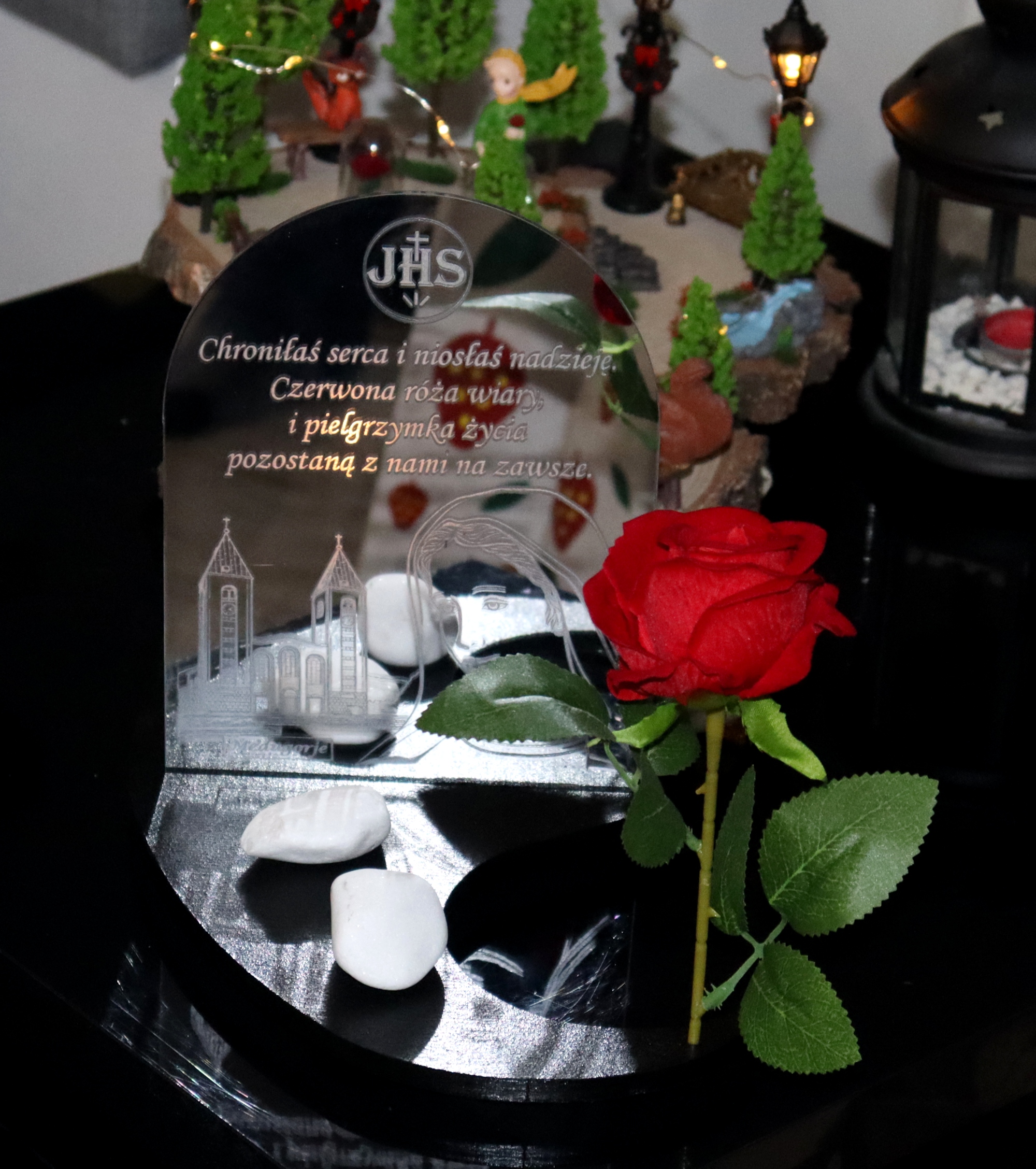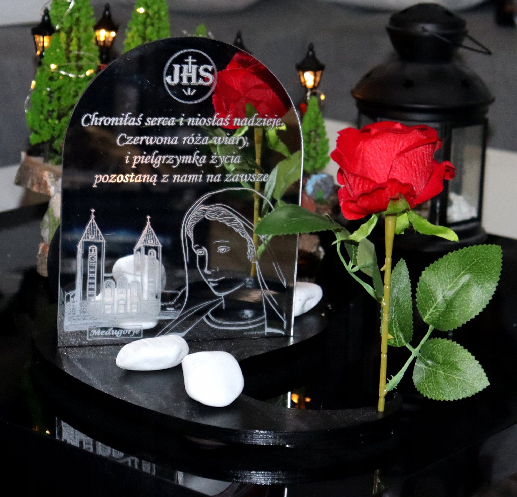 PODSTAWKA POD ZNICZ solarny NA GRÓB GRAWER czerwona biała róża złote lustro