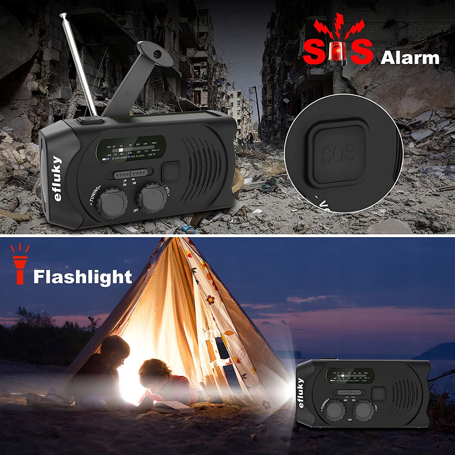 - Функції: Вуличну сонячну радіостанцію Efluky AM/FM можна використовувати не лише для прослуховування радіо та погоди, але й як павербанк на 2000 мАг, ліхтарик та SOS-будильник. Три види перезаряджуваних способів постійного живлення, легкі та легкі для транспортування, ідеальні для кемпінгу, подорожей, походів, риболовлі, виживання та надзвичайних ситуацій.