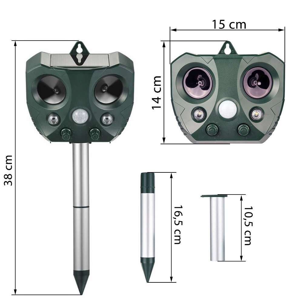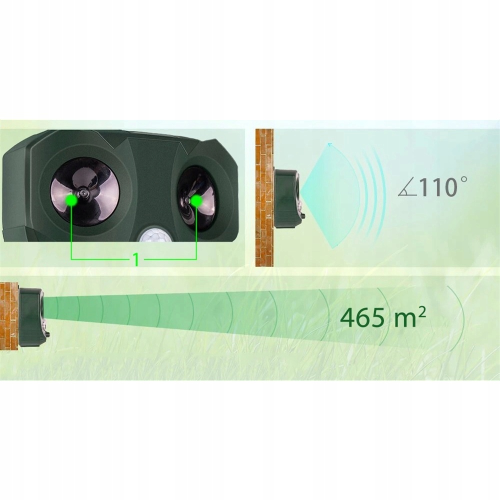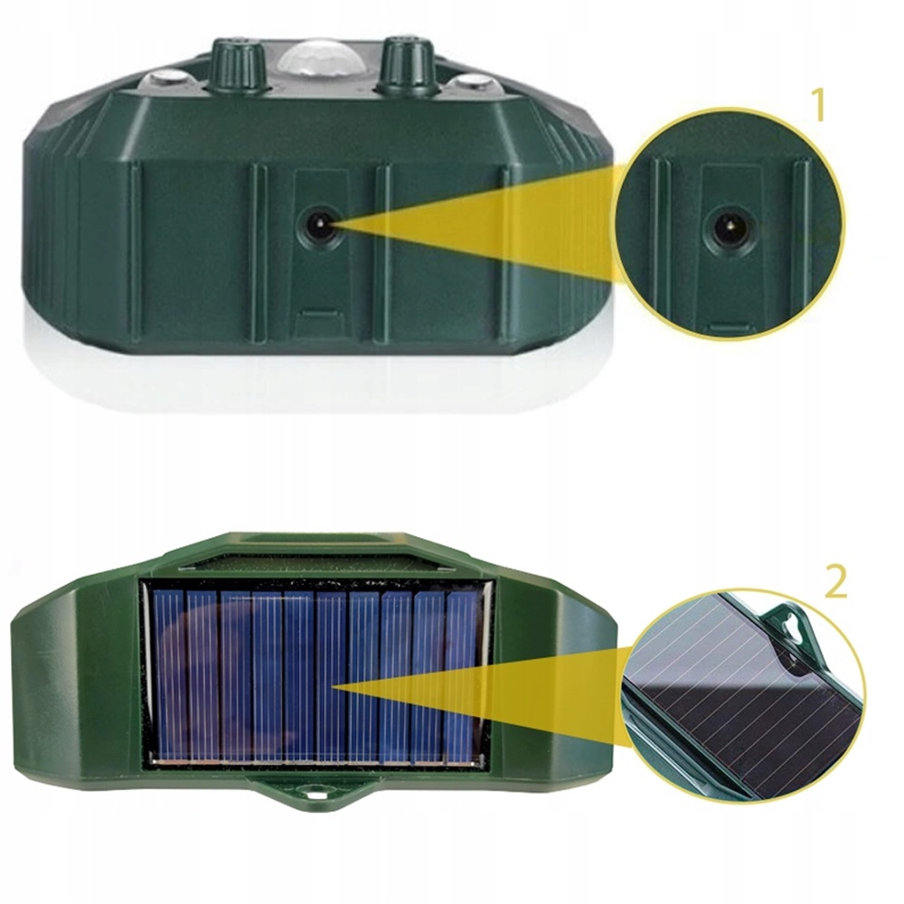 Акустичний генератор надсилає звуки, які дуже обтяжливі для всіх тварин . Вони відрізняються частотою, яка запобігає шкідникам звикнути до певного звуку і ефективно лякає його . Департамент незалежних від джерел електроенергії , завдяки використанню сонячної панелі на верхній основі. Він працює в безперервному режимі без зовнішнього джерела живлення, тобто без додаткових витрат . Це рішення ідеально підходить у всіх місцях, де немає сили для доступу.
