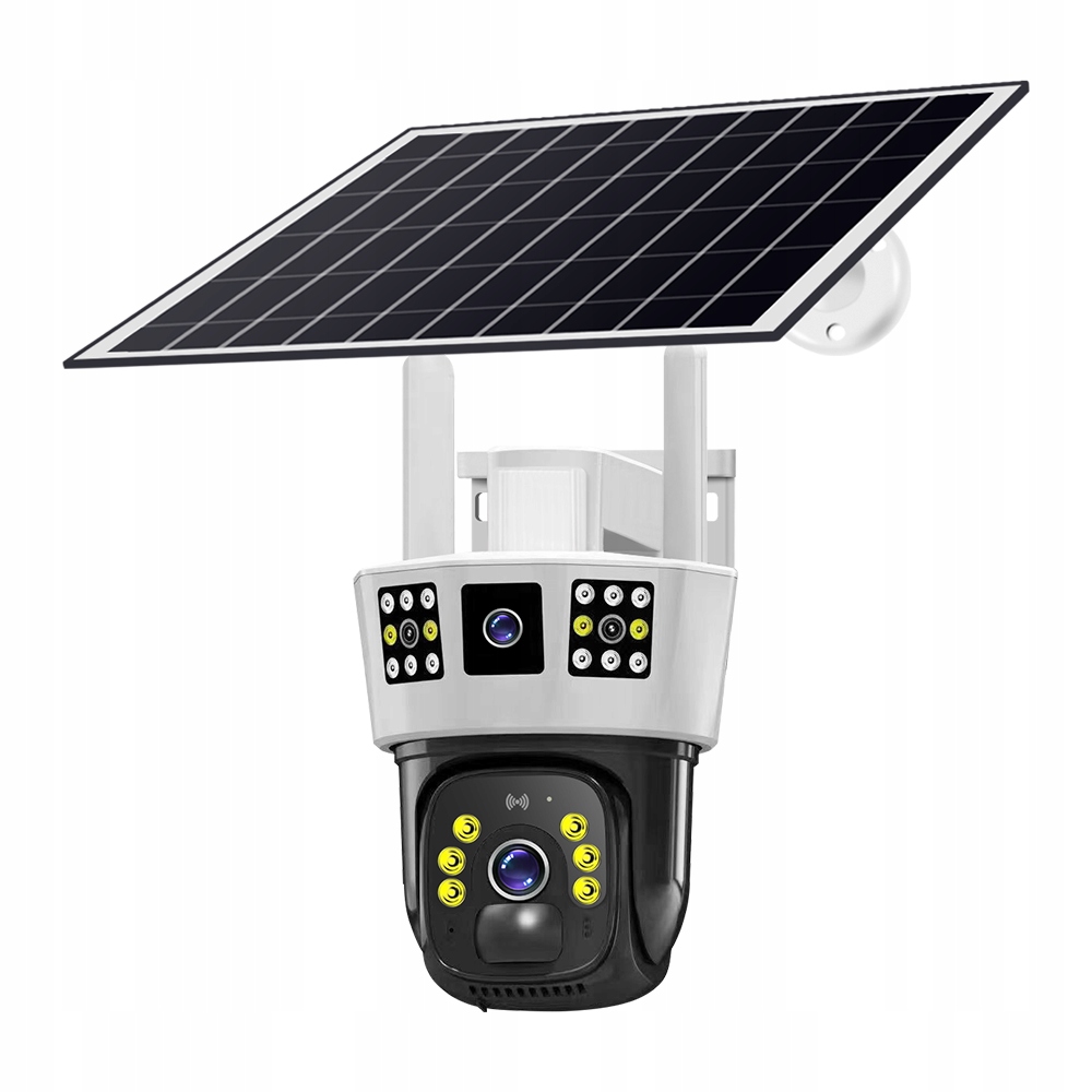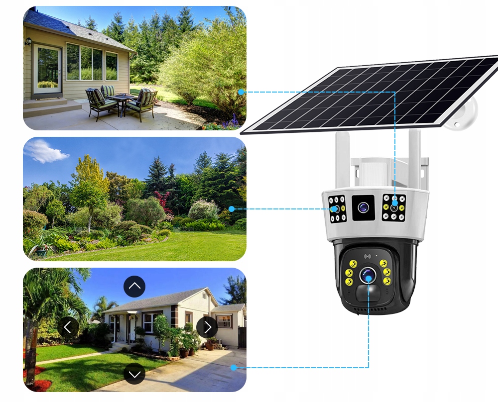 Сонячна камера з трьома лінзами та три екрани в додатку - це вдосконалений пристрій моніторингу, який забезпечує повний контроль над безпекою завдяки широкому полі зору та здатності відстежувати зображення з різних точок зору. Ось ключові особливості цієї моделі:
