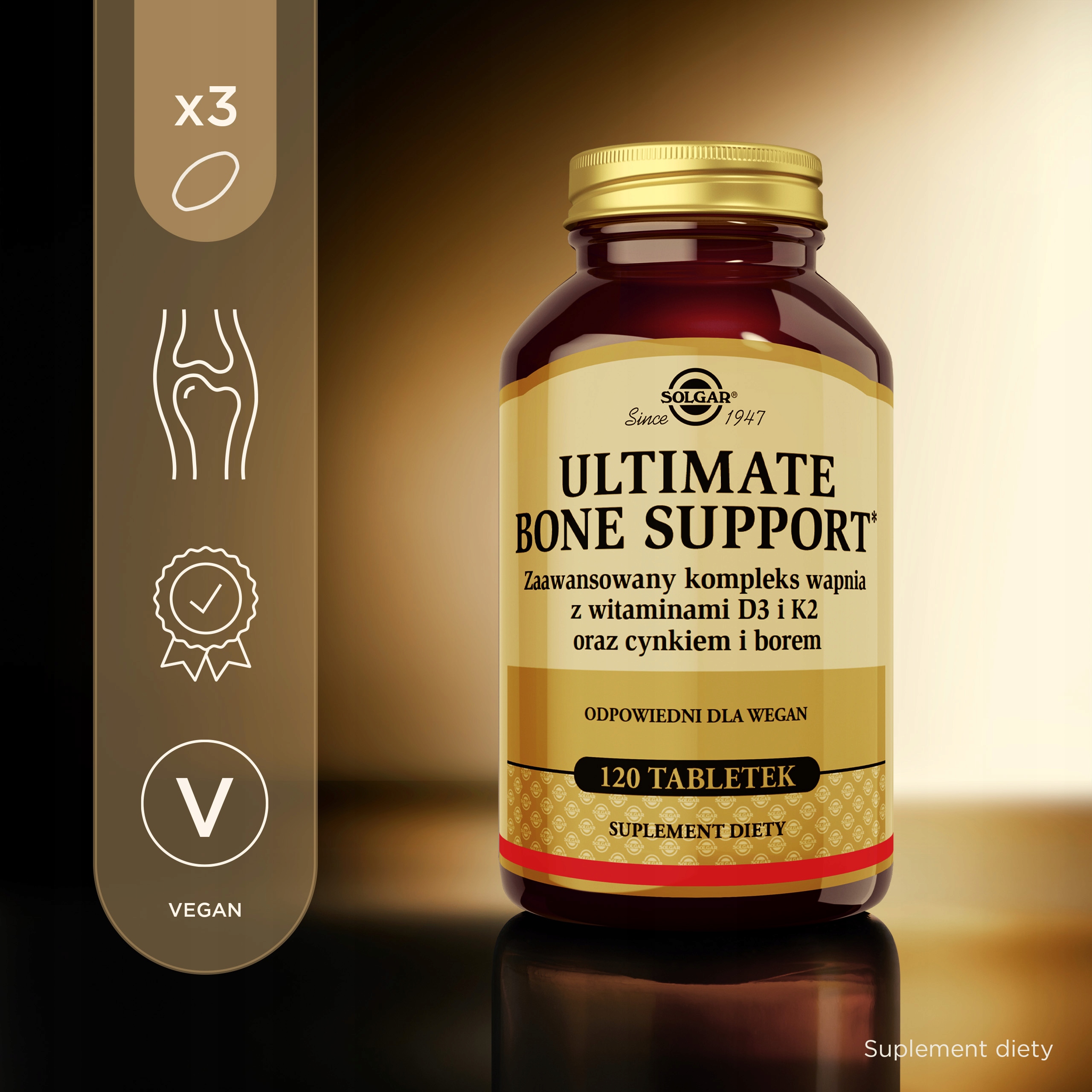 Кістки виконують ряд функцій у вашому організмі - від захисту органів, зберігання мінералів, підтримки у виробництві клітин крові. Догляд за їх станом особливо важливий для активних людей, що піддаються травмам або людям зрілого віку, яким може знадобитися додаткова підтримка. З віком організм починає втрачати здатність відновлювати кісткову масу, що може впливати на слабкість кісток. Жінки особливо чутливі до цих змін - особливо після менопаузи. Solgar Ultimate Bone Support - Спеціалізована формула, яка включає аж 7 інгредієнтів, що впливають на здоров'я кісток.