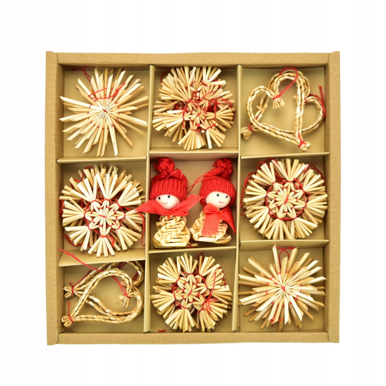 Ці прикраси з солом’яної ялинки є ідеальним доповненням до вашої ялинки. Завдяки їх природному кольору та червоних ковдрах вони додадуть справжній різдвяну атмосферу вашому дому. Кожен набір містить 30 штук цих унікальних прикрас, упакованих у красиву коробку. Завдяки цій упаковці вони також є чудовим подарунком для коханої людини. Особливості цього продукту: