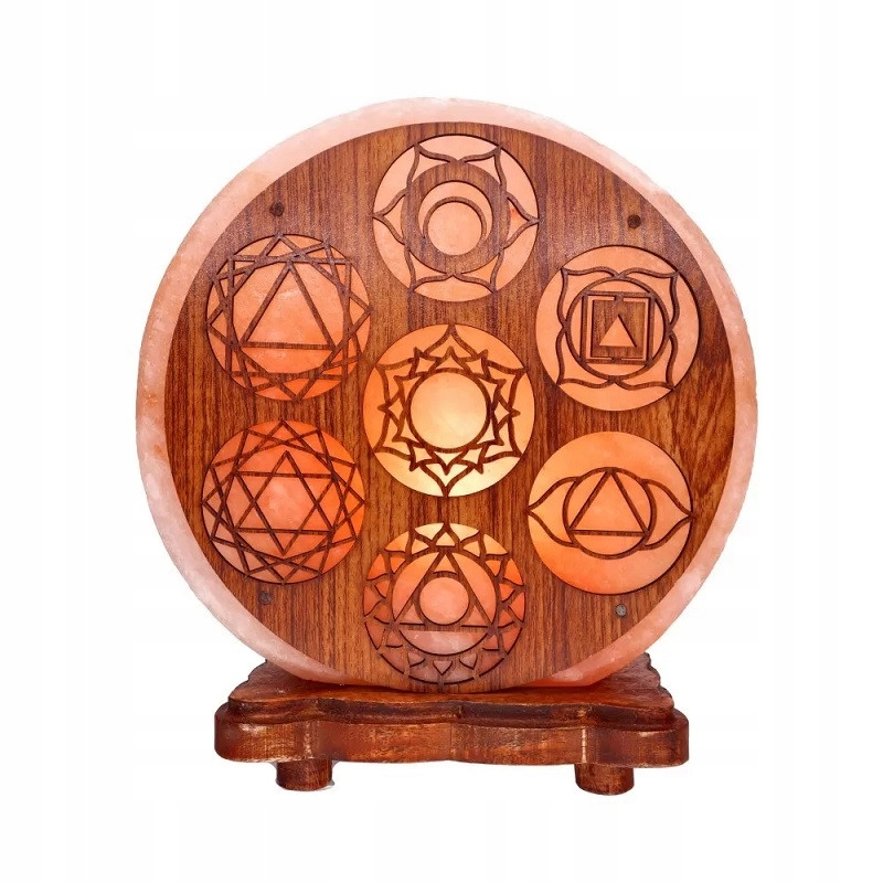 Декоративний соляний світильник "Чакри" поєднує натуральну сіль з теплим, атмосферним світлом та символом семи енергетичних центрів. Кругла грудка солі з декоративним мотивом чакри встановлена на елегантній дерев’яній основі павловнії, що робить її привабливою прикрасою для вітальні, спальні, кабінету терапії чи кімнати для йоги.