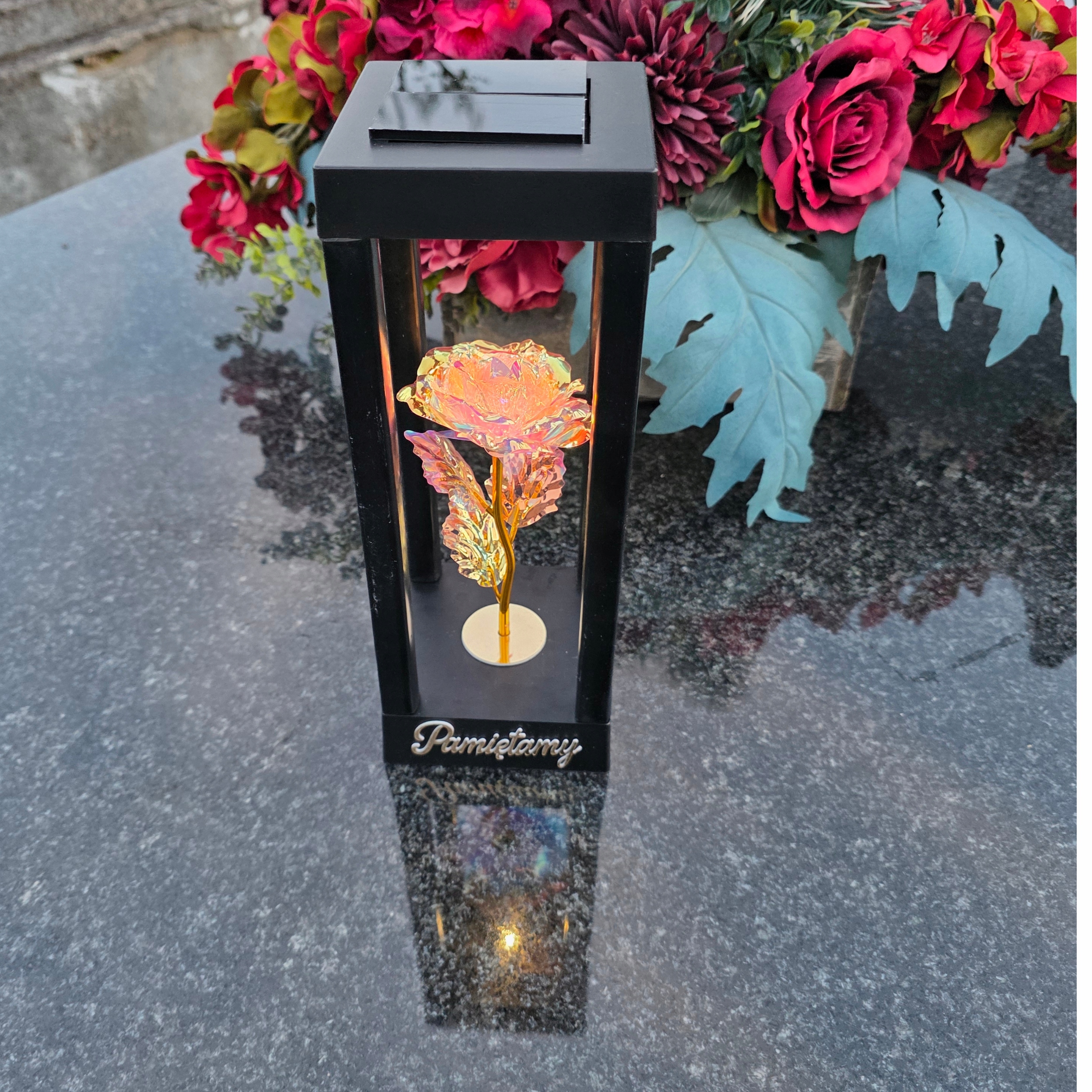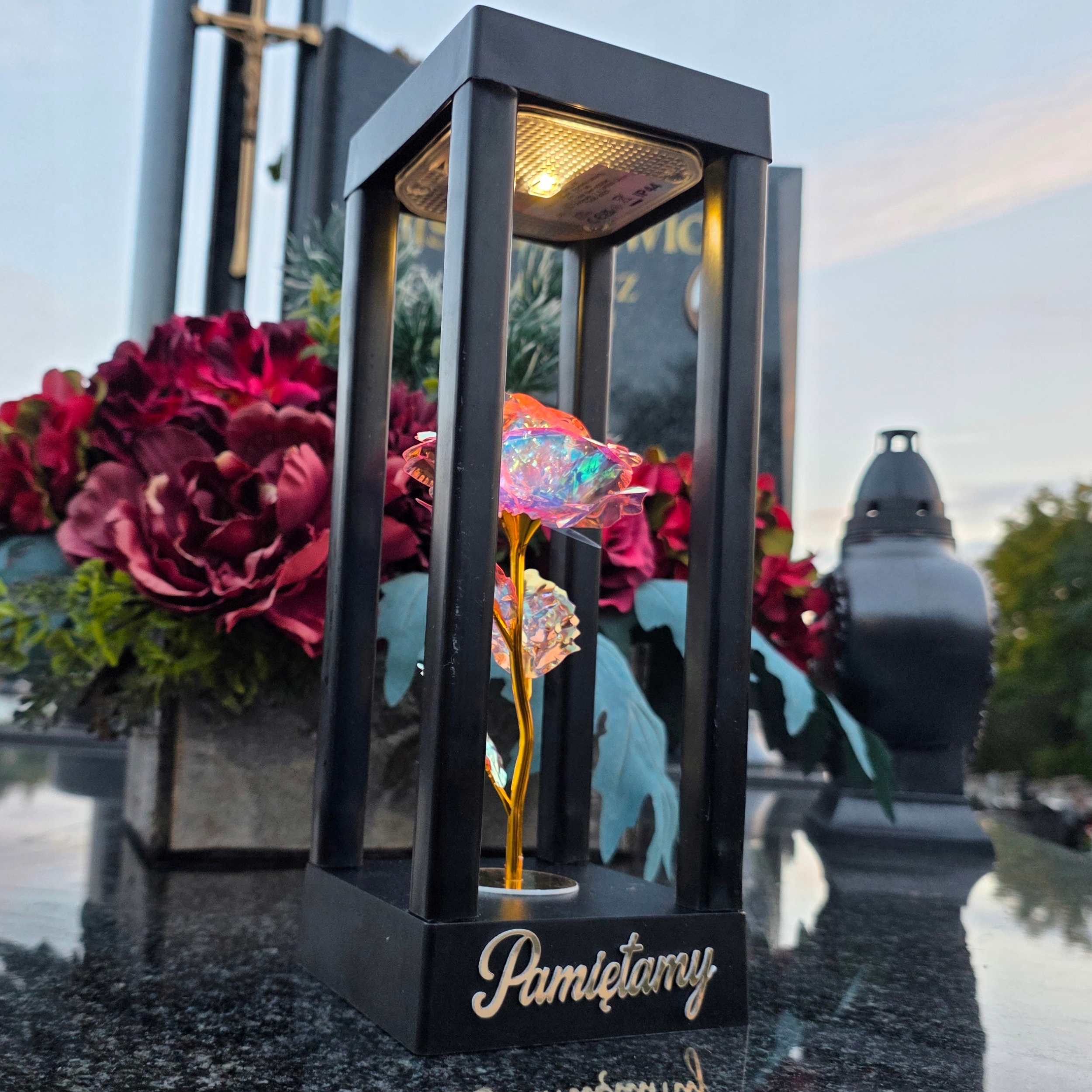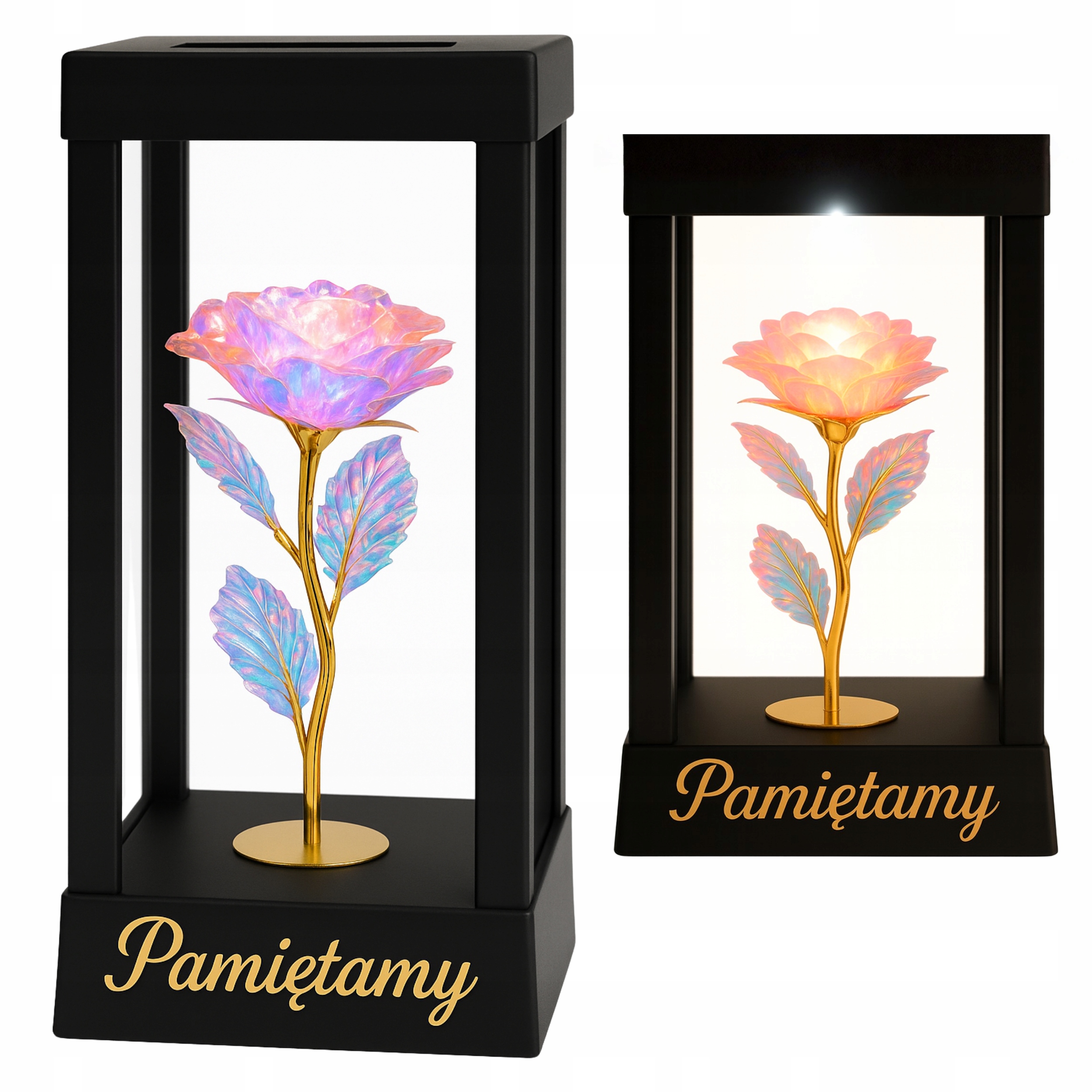 Це надзвичайна свічка, яка поєднує в собі елегантність, символізм і сучасні технології. Всередині голографічна троянда з різнокольоровими відблисками, пелюстки якої переливаються відтінками рожевого, блакитного та золотого. Після настання темряви все освітлюється делікатним світлодіодним світлом, що падає згори, створюючи феноменальний ефект глибини та сяйва - неначе квітка тліє внутрішнім світлом пам'яті.