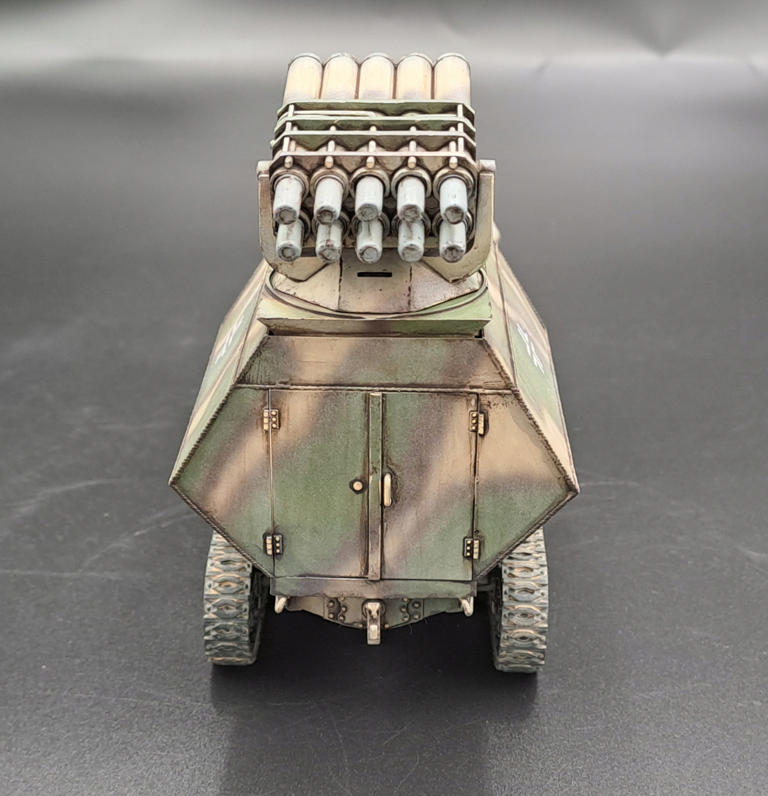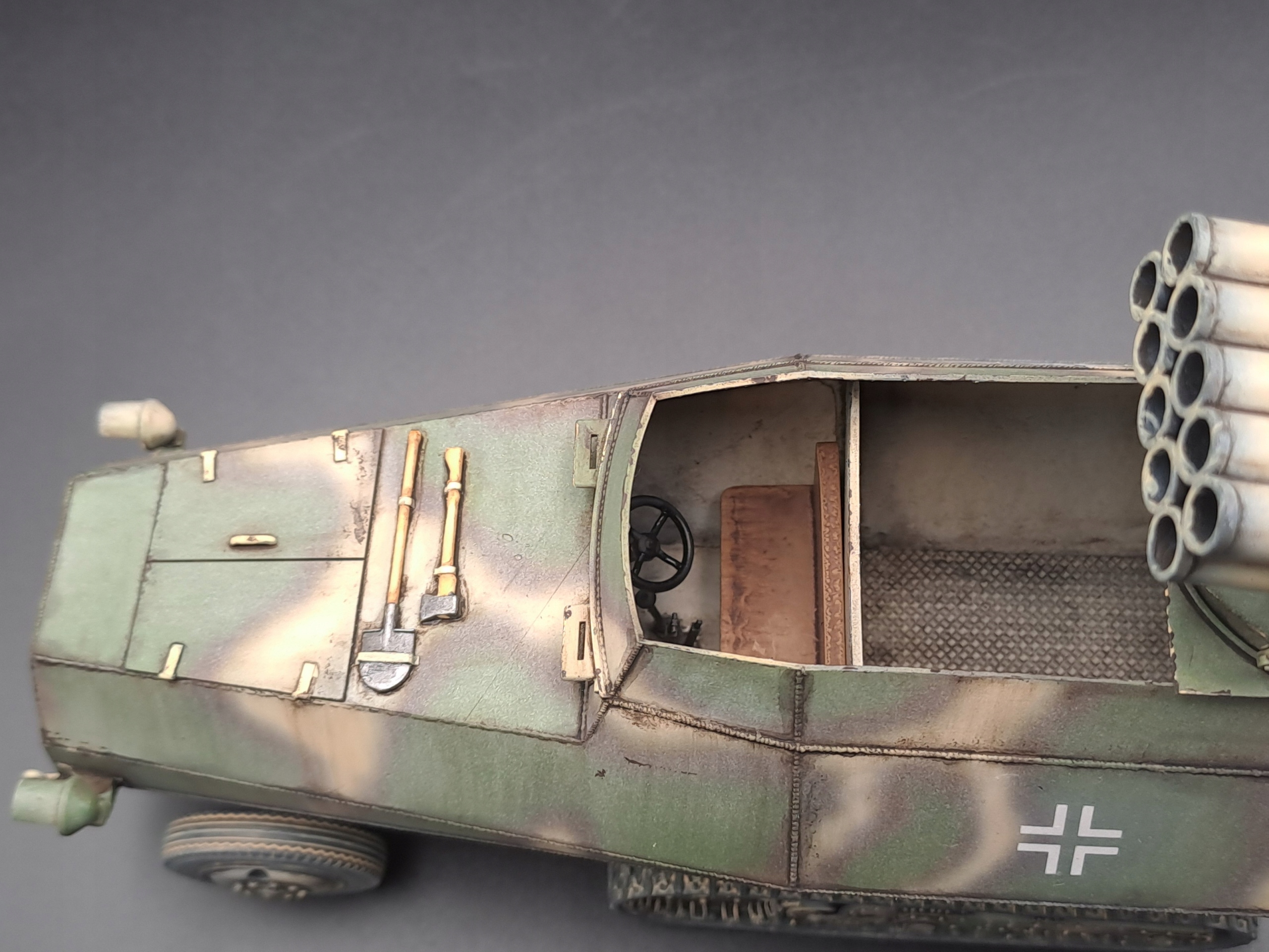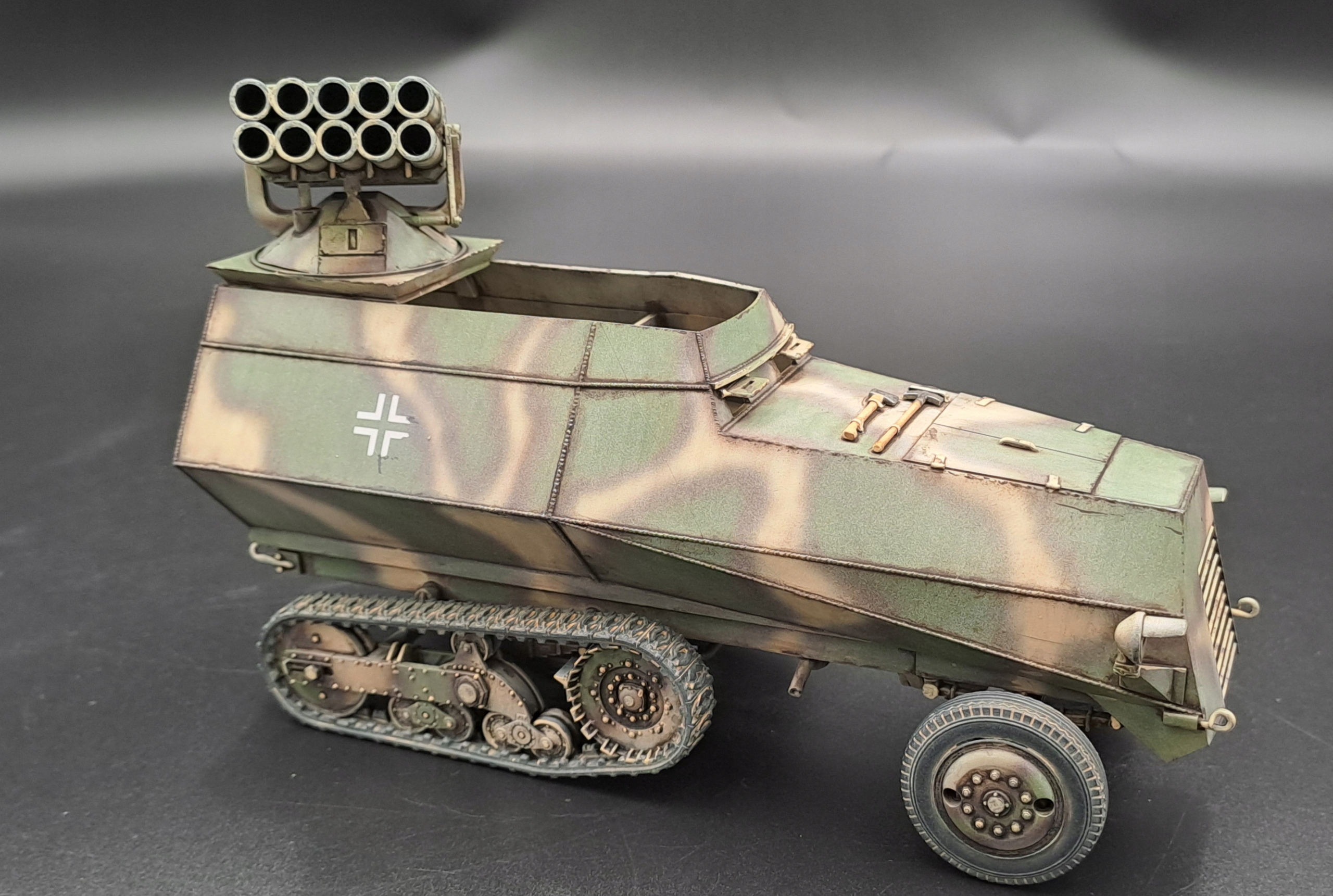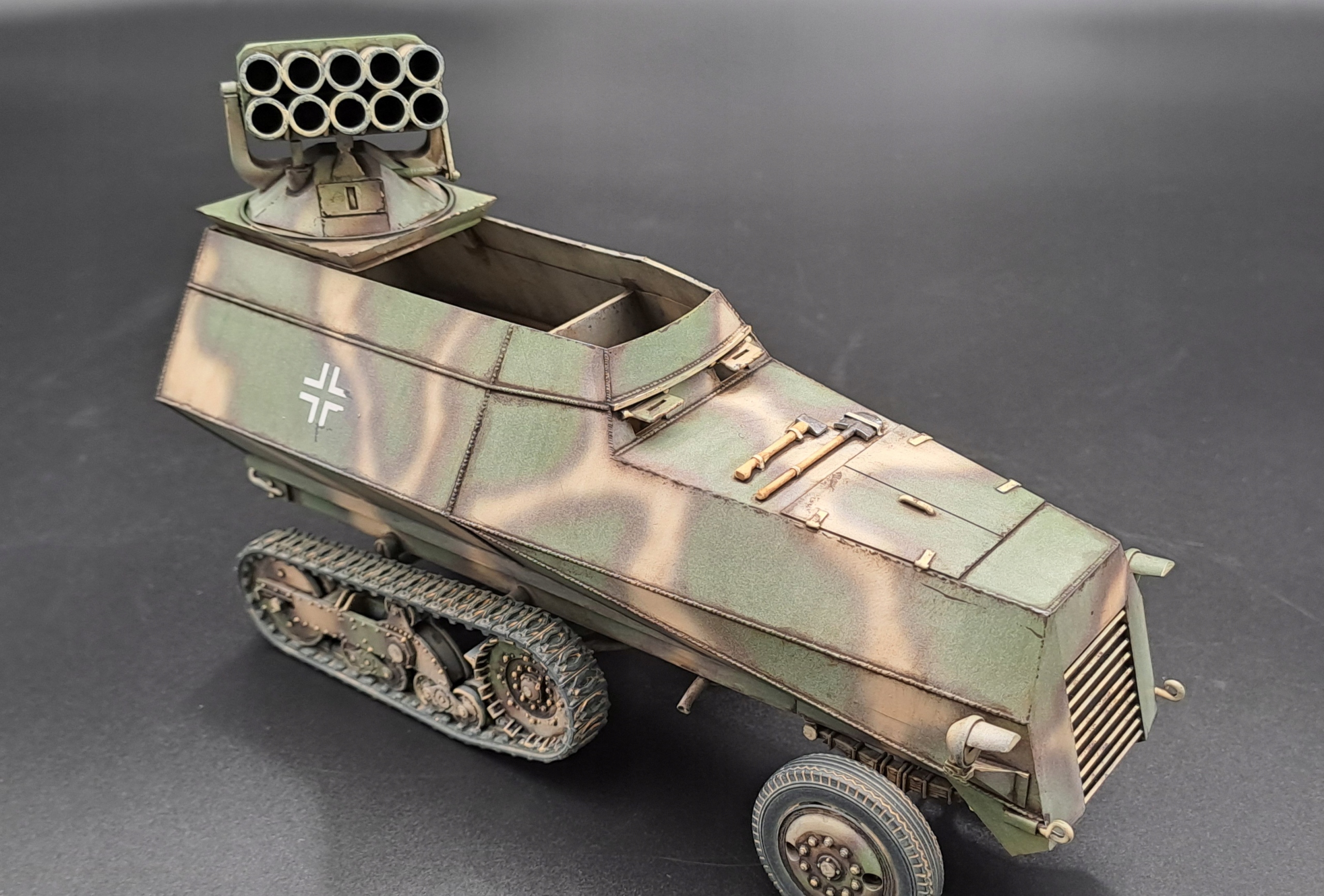 Тип машини: відремонтований і броньований артилерійський тягач Somua, захоплений німцями після капітуляції Франції, переобладнаний на носій ракетної установки. Озброєння: навісна 15 см реактивна система залпового вогню Nebelwerfer 42, яка використовується для придушення вогню. Калібр ракети: 150 мм Кількість напрямних: 6 або 10 (в залежності від версії) Дальність стрільби: приблизно до 7000 метрів Використання: знаряддя підтримки артилерії, яке використовується для обстрілу позицій противника з дальньої дистанції. Ракети видавали характерний звук, через що пускові установки в просторіччі називали «коровами» або «шафами». Мобільність: завдяки використанню шасі стріли Somua машина була більш стійкою та мобільною, ніж класичні буксирувані пускові установки Nebelwerfer. Ця машина є прикладом німецької військової імпровізації – поєднання трофейної техніки з власними технологіями для підвищення вогневої потужності та мобільності артилерійських підрозділів. Таблиця запропонованих кольорів для Somua Nebelwefer 42 (KM-007) Місія Моделі Позначення кольору Назва кольору Додаток MMP-019 Dunkengelb RAL 7028 Основний колір MMP-012 Rotbraun/RAL 8017 Колір камуфляж MMP-018 Resedgraun/RAL 6011 Камуфляжний колір MMP-047 Чорне кермо Шина ММР-040 Чорна Шини, гусениці Клей і фарби не входять. Клей і фарба не входять. Використовуйте ціаноакрилатний клей, щоб склеїти предметну модель.