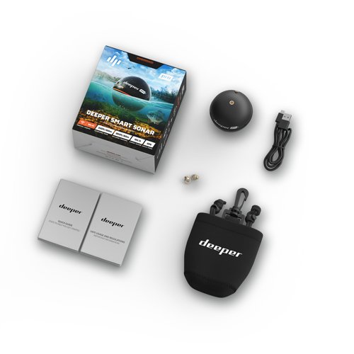Ехолот Deeper Smart Sonar PRO+2, USB-кабель, портативний неопреновий чохол, 2 гачки для кріплення, короткий посібник користувача, посібник користувача, посібник з рецептами.