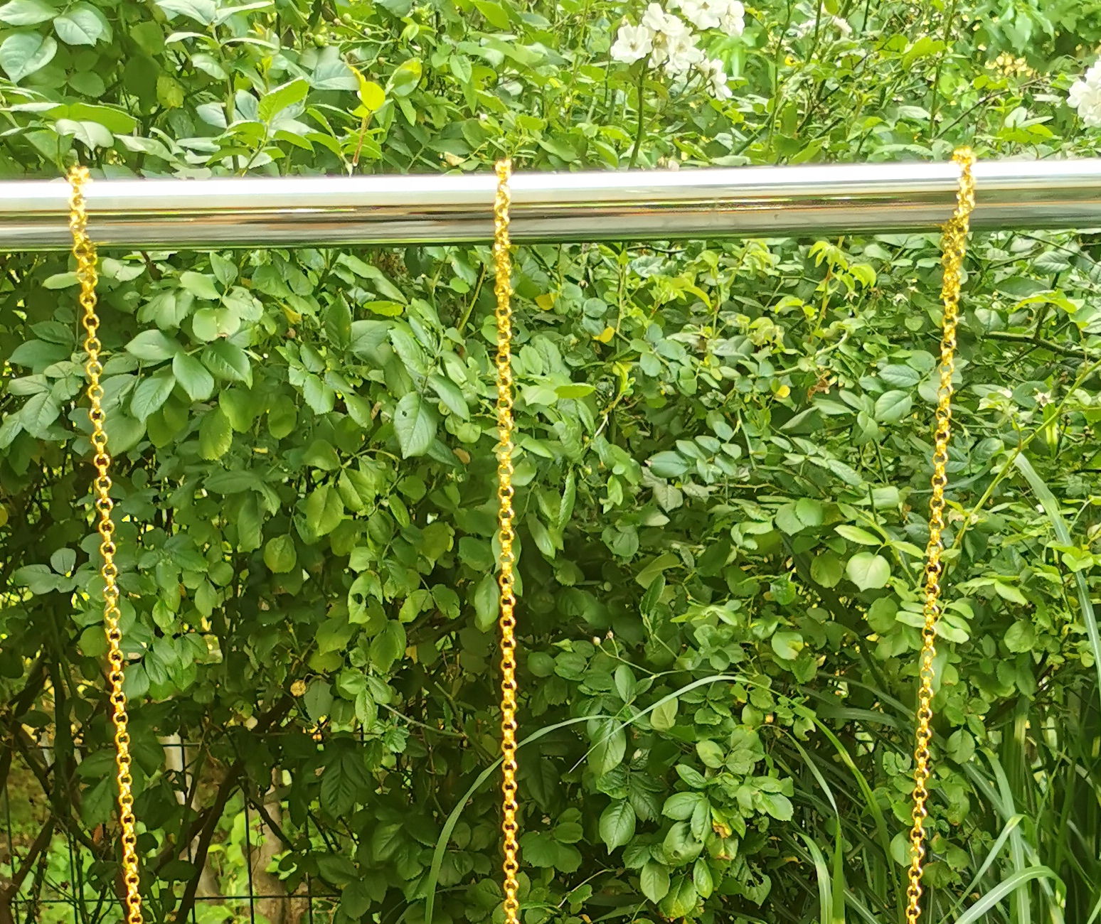 Скляні намистини 14 мм, з'єднані металевими колесами. Золотий ланцюг кріпиться зверху, щоб регулювати довжину.