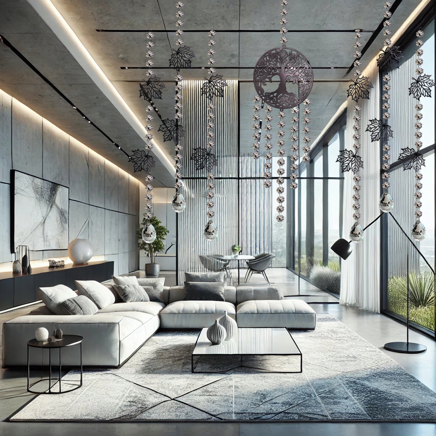 the the Beads має 50 -х р. Панель - трубка зі срібною ниткою, вона ідеально вписується з блискучим деревом. Трубка у верхній частині має петлю, яка дозволяє прикріпити панель з трубкою штор -стрижня або жабою. Довжина трубки - 40 см.