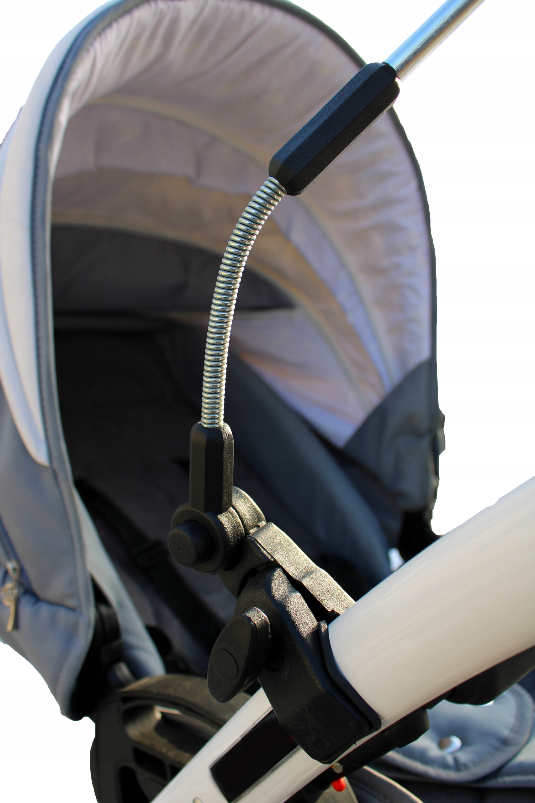 Дуже стійкий універсальний затискач із нековзкими гумовими протекторами підходить майже до всіх круглих або овальних каркасів колясок із діаметром труби приблизно до 3,0 см. Гумові протектори захищають фарбу коляски та запобігають ковзанню штанги. Завдяки кнопці парасольку можна легко зняти із затискача та за кілька секунд знову підключити без необхідності знімати кріплення- універсальний тримач потрібно встановити лише один раз. Парасолька має два регулювання у вигляді пружин, які можна обертати на 360°, щоб легко встановити її в потрібне положення.