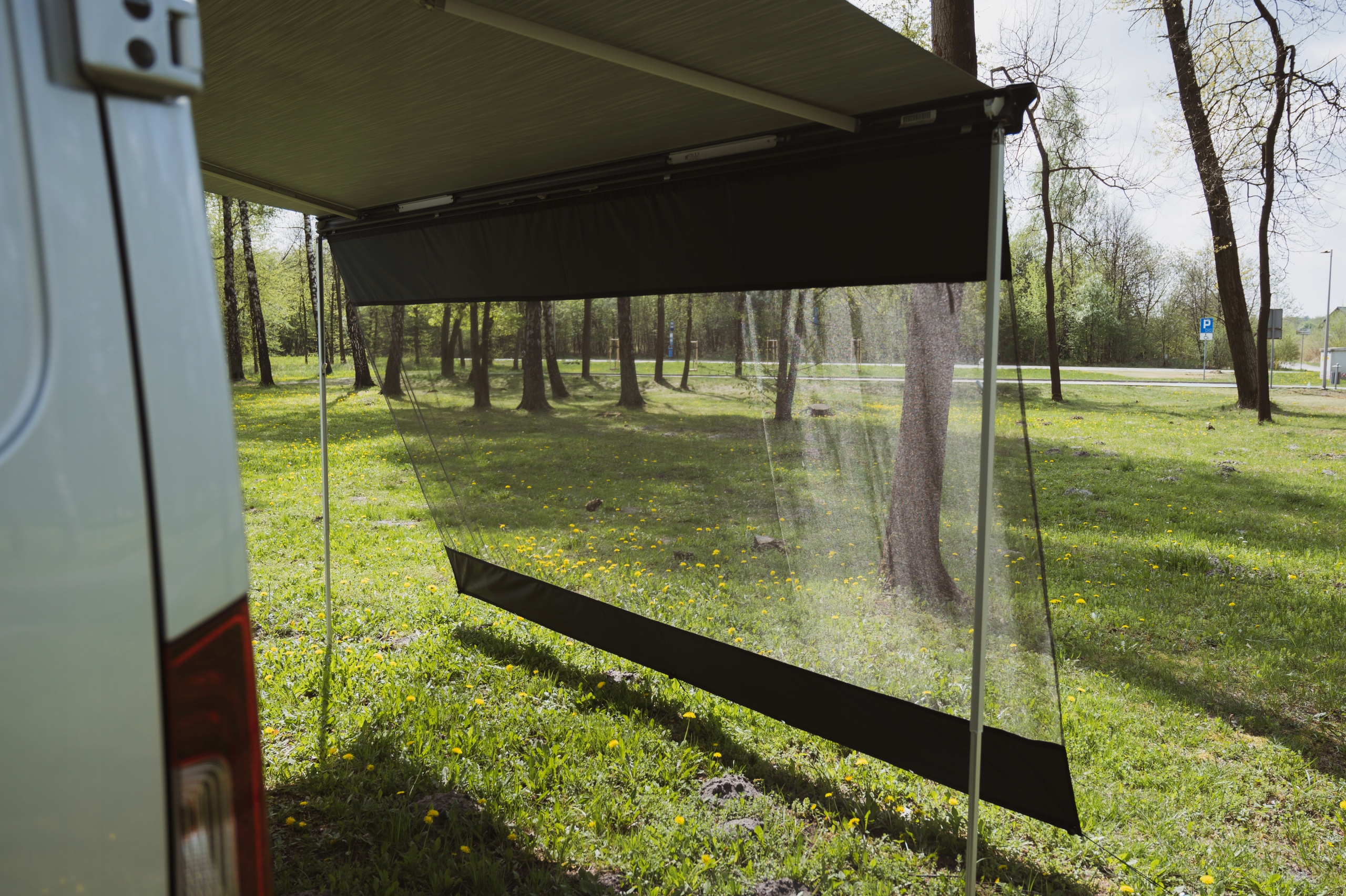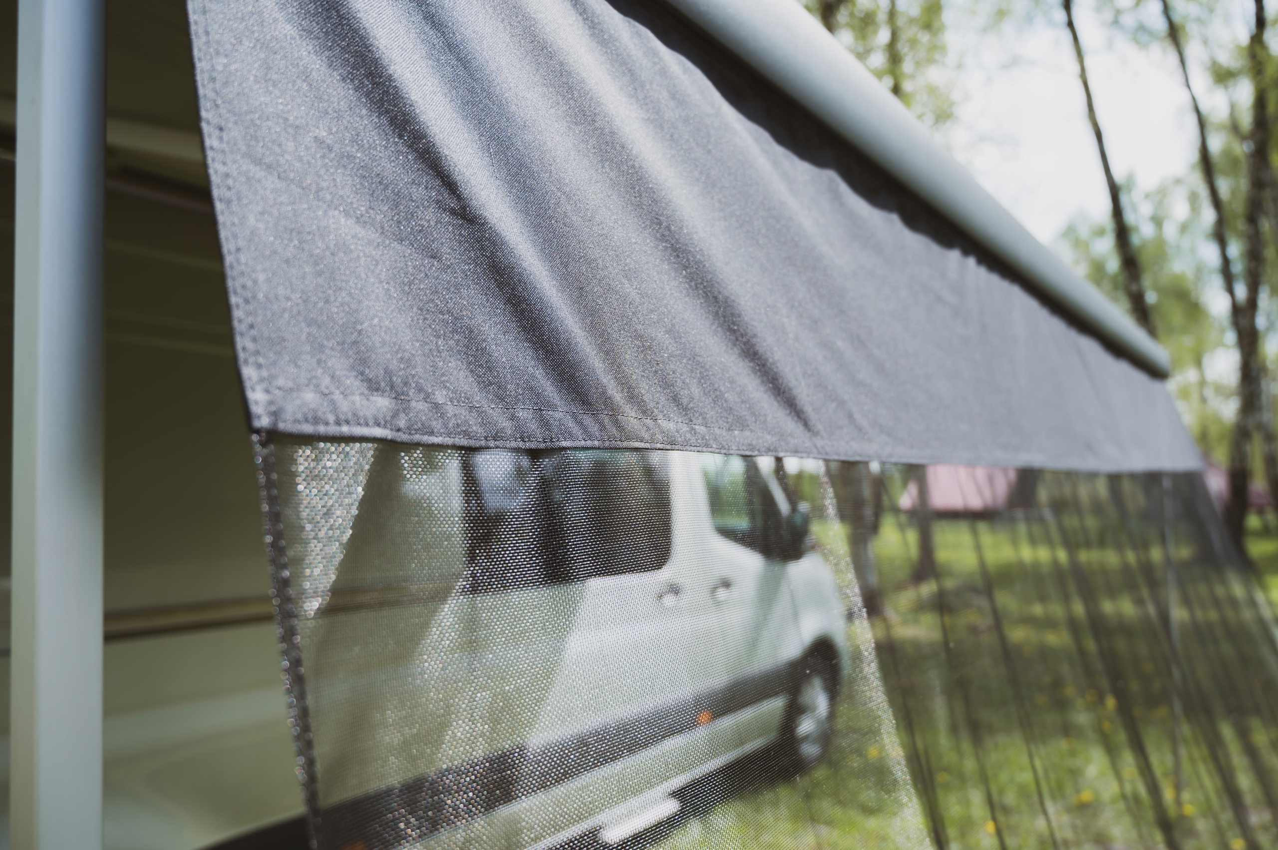 Зроблено з напівпрозорої сітчастої тканини, яка частково блокує сонячне світло і захищає від неприємних прямих сонячних променів. Він також забезпечує конфіденційність у каравані чи кемпері. Мешканець покриватиметься від сонця, яке світить під тентом. Просто ковзайте в кедра/ стрічку, яка закінчена краю стіни, у скрабі передів, і різке сонячне світло більше не заважатиме. Виробництво польського виробництва!