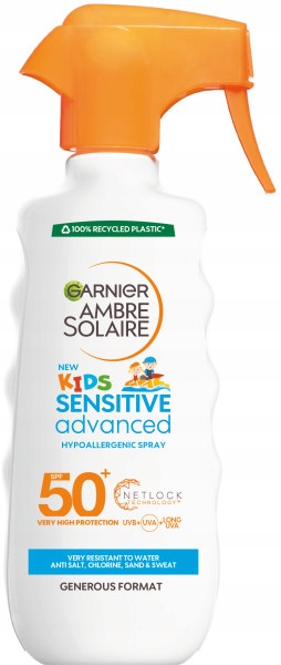 Захисний спрей для засмаги Garnier Ambre Solaire Kids Sensitive SPF50+ для дітей Garnier Sensitive Advanced Protective Spray SPF50 для дітей — ідеальний засіб для засмаги для ніжної та чутливої до сонця шкіри. Забезпечує дуже високий захист від шкідливого ультрафіолетового випромінювання. Його формула стійка до факторів, які можуть знизити ефективність захисту, таких як вода, пісок і піт.