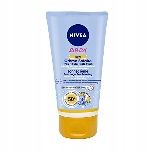 NIVEA BABY - Сонцезахисний крем SPF 50+ надійно захистить чутливу шкіру малюка. Захищає від сонячних опіків і пошкоджень шкіри, спричинених ультрафіолетовим випромінюванням. Крем містить високоефективну систему фільтрів UVA і UVB, які створюють захисний шар на ніжній шкірі дитини і надовго захищають її від сонячного випромінювання. Спеціальна формула косметичного засобу містить вітамін Е, завдяки чому воно має живильні властивості, а екстракт алое додатково зволожує ніжну шкіру дитини. Крем безпечний для шкіри: не містить ароматизаторів і барвників і мінімізує ризик алергії, спричиненої УФ-випромінюванням. Продукт пройшов клінічні та дерматологічні випробування. Його можна використовувати дітям старше трьох місяців.