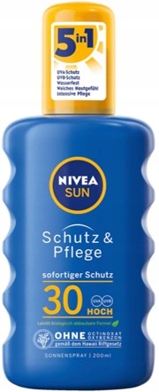 NIVEA Sun Schutz&Pflege SPF30 Сонцезахисний спрей 200 мл, завдяки використанню ретельно підібраного складу фільтрів UVA та UVB, забезпечує ефективний і миттєвий захист від сонця. Засіб має зручний аплікатор, що робить нанесення косметичного засобу швидким і безпроблемним. Нежирна консистенція швидко вбирається, не залишаючи відчуття липкості на шкірі. Насолоджуйтесь здоровою засмагою та обирайте спрей для засмаги від бренду NIVEA!