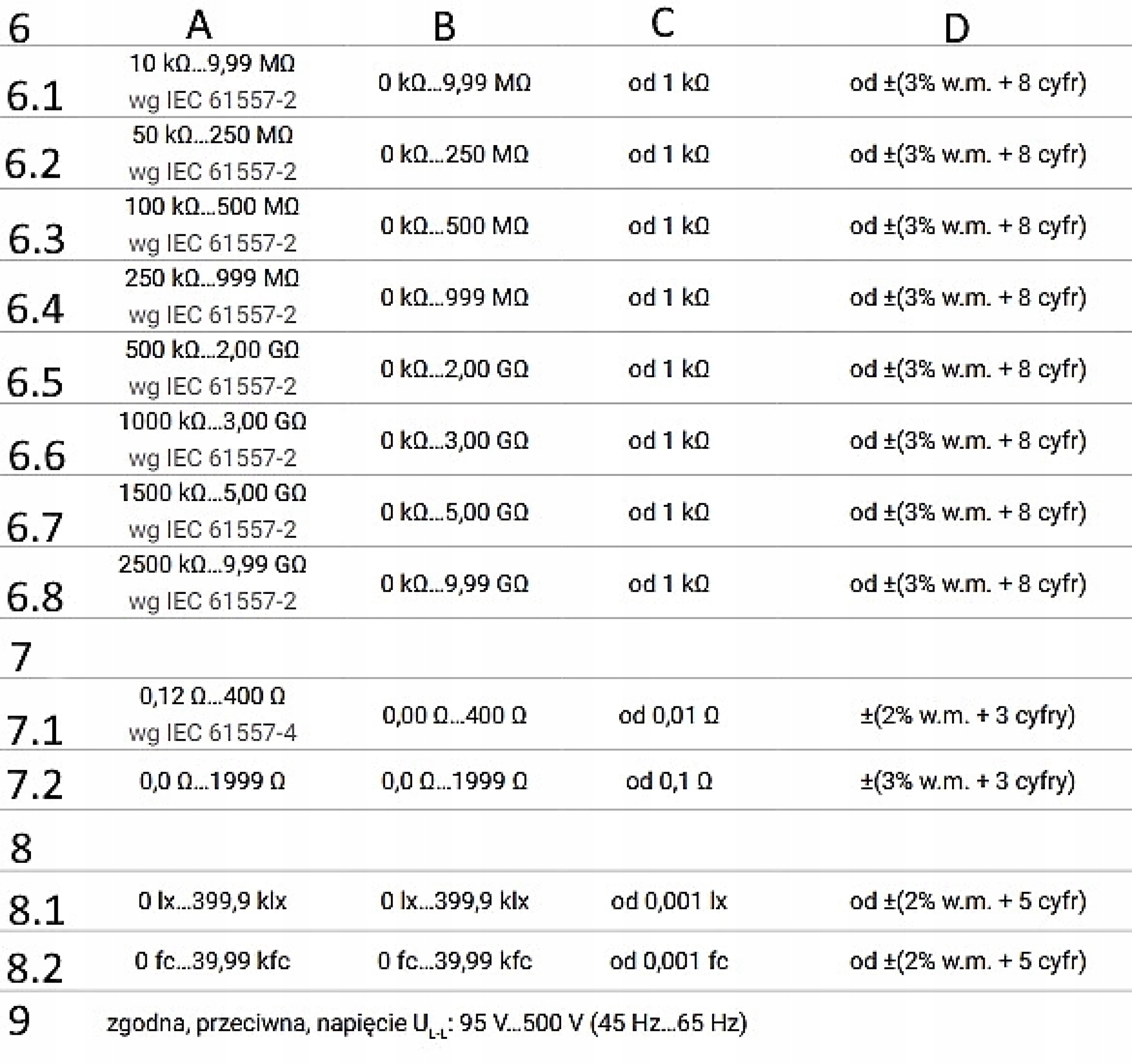 - Тип ізоляції згідно PN-EN 61010-1 та IEC 61557: Подвійний