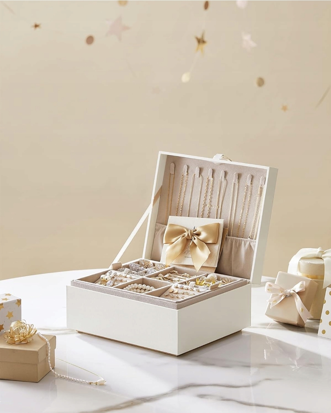 SONGMICS Шкатулка для прикрас, двох'ярусна, органайзер, білий,