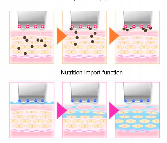 Проникнення ультразвукових хвиль забезпечує шкірі масаж, а також ретельне очищення. Пристрій може усунути проблемні зміни кольору, зморшки, прищі та очистити пори.