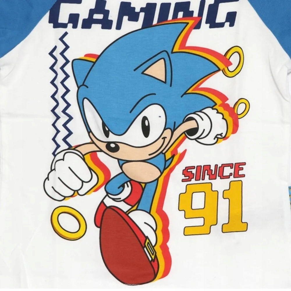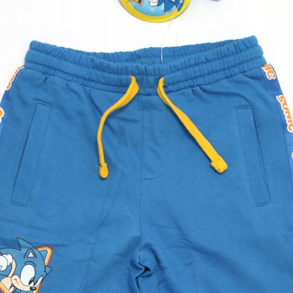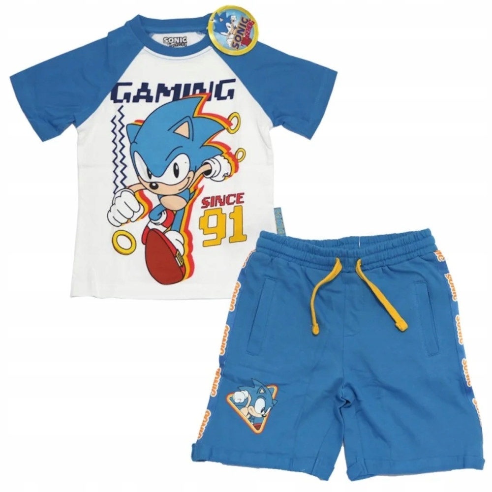 Літній набір з короткими рукавами та короткими звуковими піклами. Блусер з короткими білими рукавами з блакитними рукавами з друком персонажа з популярної гри для дітей Сонік. S Podenki синіми, заглибленими кишенями, світильниками з написом Sonik з боків ніг, на талії вони мають широку марну еластичну смугу та струну для регулювання. Приємно до дотику бавовни. Sonic Set Original під ліцензією, перша якість з набором тегів. М'який принт.