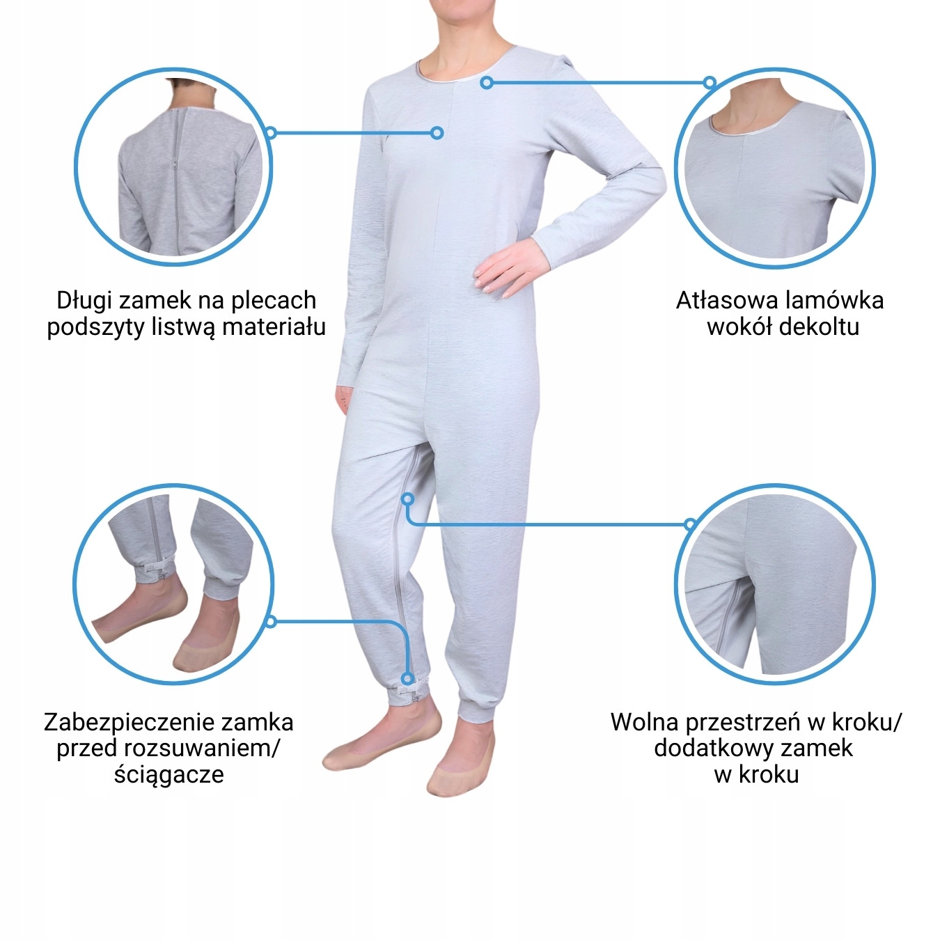 - • Легка одягання та заміна памперсів завдяки використанню окремого замку в ногах