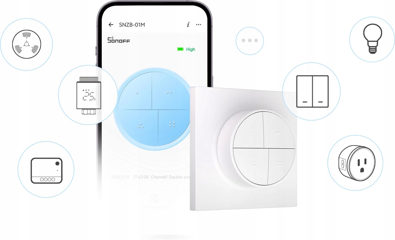 Універсальний 4-кнопковий бездротовий перемикач сцен, призначений для централізованого керування вашим розумним будинком. Orb 4-in-1 підтримує режими Zigbee і eWeLink-Remote, пропонуючи автоматизацію та надійне локальне керування.