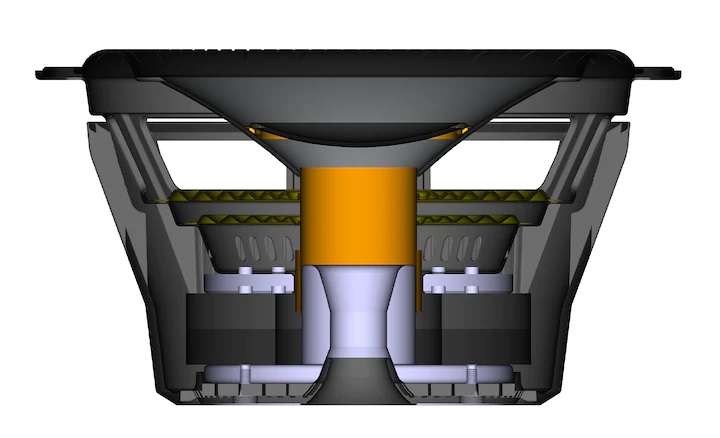 Акустично оптимізована пружина збільшує вхідну потужність і повітряний потік, а її профіль дозволяє швидше й точніше демпфувати диффузор динаміка. Щоб забезпечити чистоту сигналу і уникнути спотворення звуку, дріт, що веде до звукової котушки, також кріпиться до пружини. Це обмежує рух кабелю.