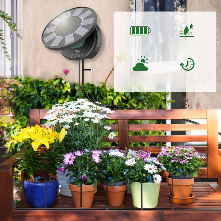 - ✔ Завдяки сонячній панелі, вам не доведеться підключати систему до джерела живлення - достатньо, щоб ви встановили її в свердловину, а решта відбувається сам по собі. Це рішення особливо корисне, якщо ви дбаєте про екологію та хочете зменшити споживання електроенергії. Сонячне джерело живлення також дає повну мобільність - ви можете вільно змінити систему роботи, не турбуючись про доступ до джерела живлення. Панель працює ефективно навіть при частковому сонячному світлі, що збільшує його зручність. Вибираючи сонячну зрошувальну систему для автоматичного зрошення садових балконів, ви отримуєте не тільки зручність, але й реальну заощадження. 4 Вам більше не потрібно пам’ятати про полив, оскільки система зробить це за вас відповідно до встановленого розкладу. Таймер простий у використанні і дає вам можливість відповідати циклам з поточними погодними умовами. Ваші рослини матимуть постійну кількість води, що вплине на їх стан. Завдяки цьому весь процес стає автоматизованим, безпечним та економічним.