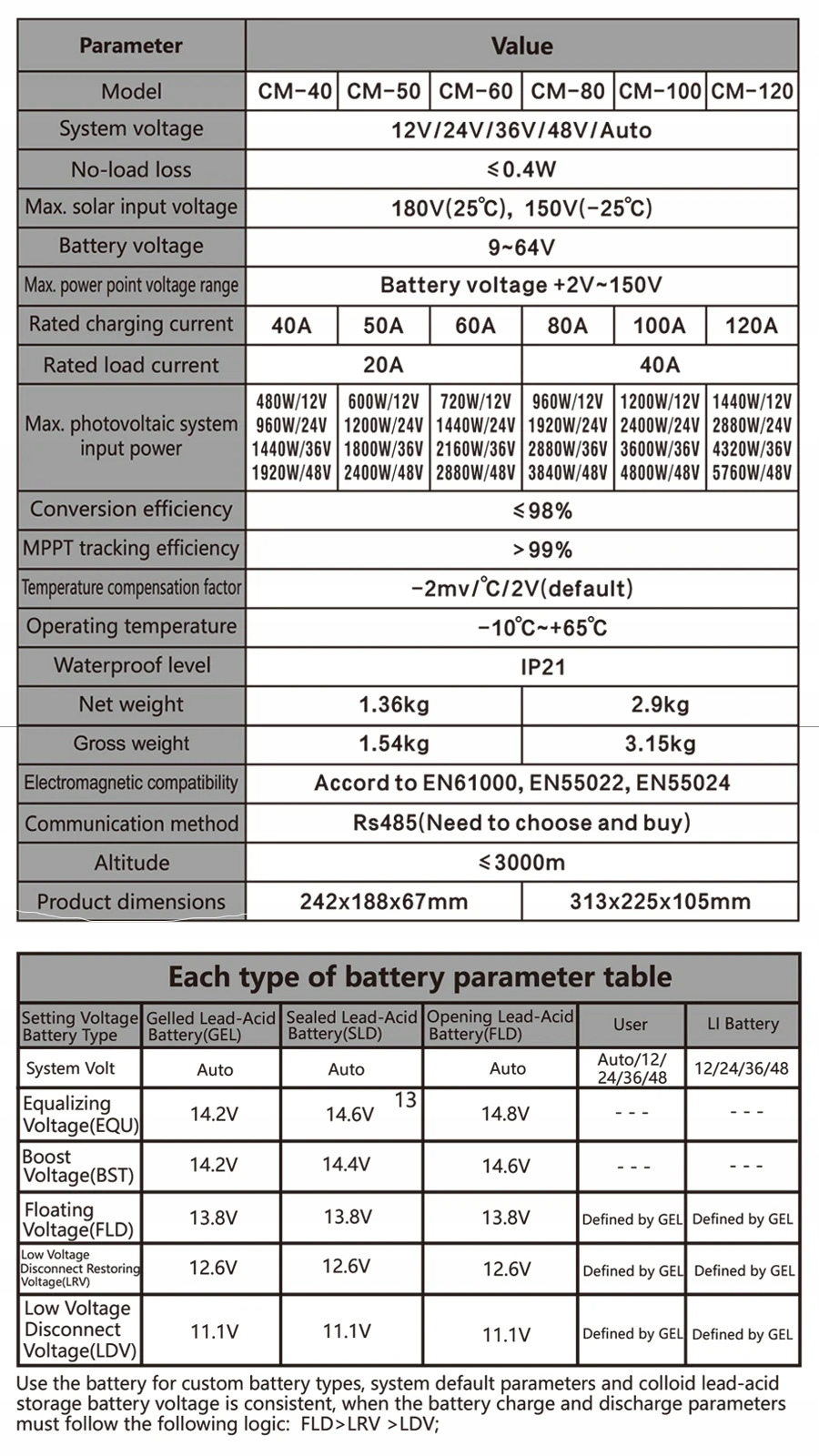 для фотоелектричних панелей, підключених до акумуляторів з напругою 12 В, 24 В, 36 В і 48 В реального MPPT,