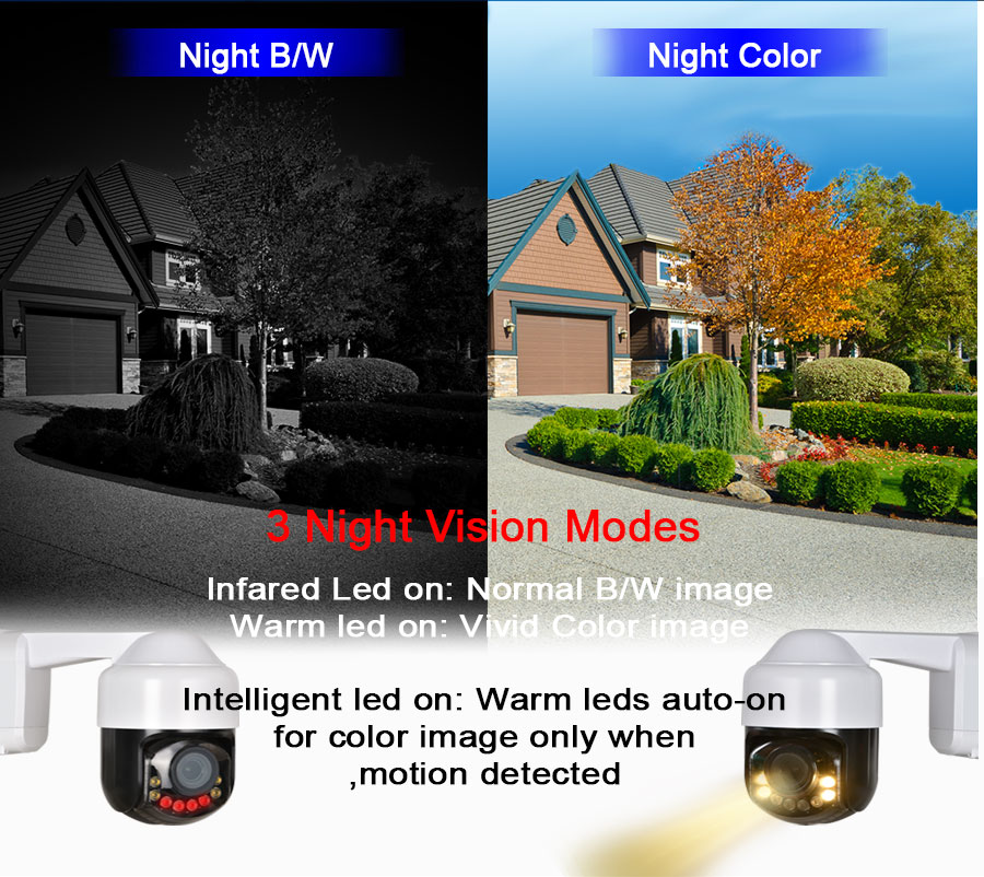 - 4 керамічні світлодіоди, 4 світлодіоди теплого світла, ІЧ-відстань 60 м. 3 режими світлодіодів для нічного бачення: нормальний/кольоровий/розумний