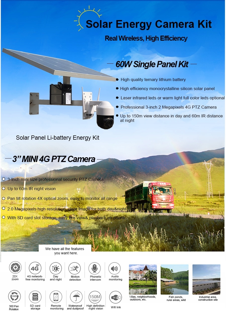 - З комплектом сонячної енергії, сонячною панеллю 60 Вт + літій-іонним акумулятором 30 А·год + тримачем + гвинтовим пакетом, до 50 годин безперервної роботи навіть без заряджання.