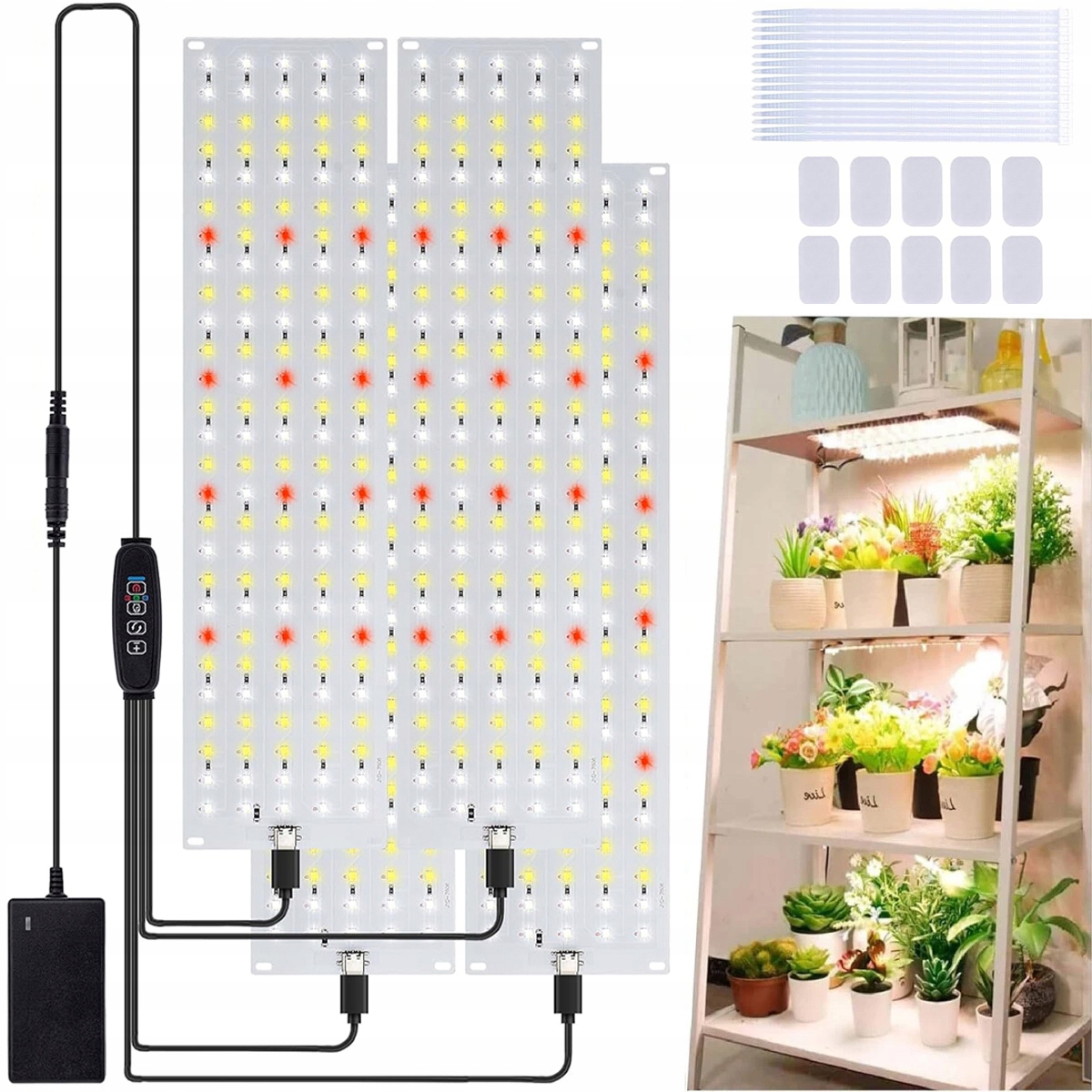 Світлодіодний світильник для вирощування своїми руками має 4 ультратонкі панелі. Світильник для рослин Гнучкий для конфігурацій різної довжини або ширини. Світлові панелі можна повісити за допомогою зручних кабельних стяжок або заховати під полицю/шафу за допомогою липкого двостороннього клею 3M, щоб заощадити місце. Підвісні світильники для вирощування можуть значно покращити світлове покриття та ефективність рослин.