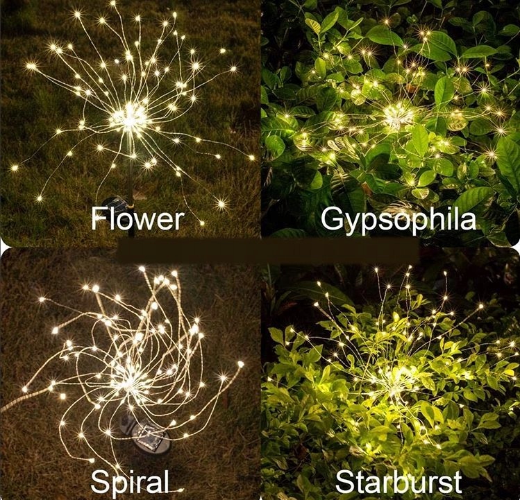 сонячна лампа, що імітує кульбаби з 30 мідними смугами, оснащеними по 3 діодах кожна - 90 діодів разом. Є 3 штуки. Оправка виготовлена з стійкої до кислоти трубки, на якій вбудована сонячна панель з акумулятором 1,2 В, 600 мАг (пальців). Довжина стрижнів з діодами становить близько 11 см кожна. Вони можуть бути сформовані будь -яким чином. Світлий колір: Білий.