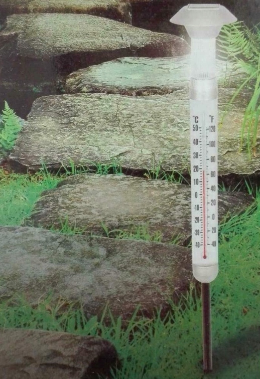 Термометр має вбудовану сонячну панель вгорі, яка живить світлодіод, розміщений під ним. Світло виділяється зверху термометра.