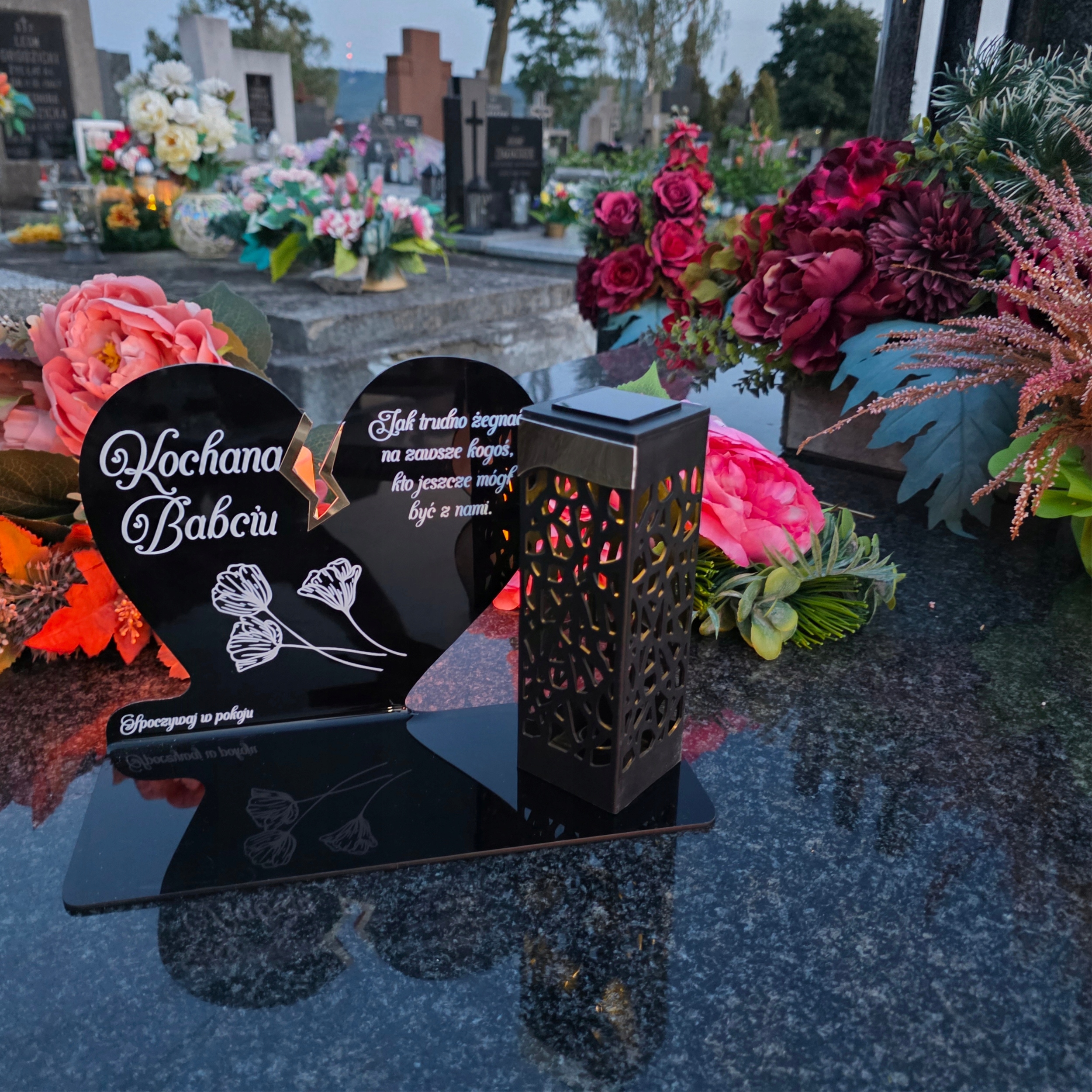 Це надзвичайний сувенір, який поєднує традиції з сучасністю. Поєднання серця із золотим акцентом і високої сонячної лампи створює ефект елегантності та тривалого сяйва пам’яті, яке освітлює надгробок цілий рік – без необхідності заміни вставок.