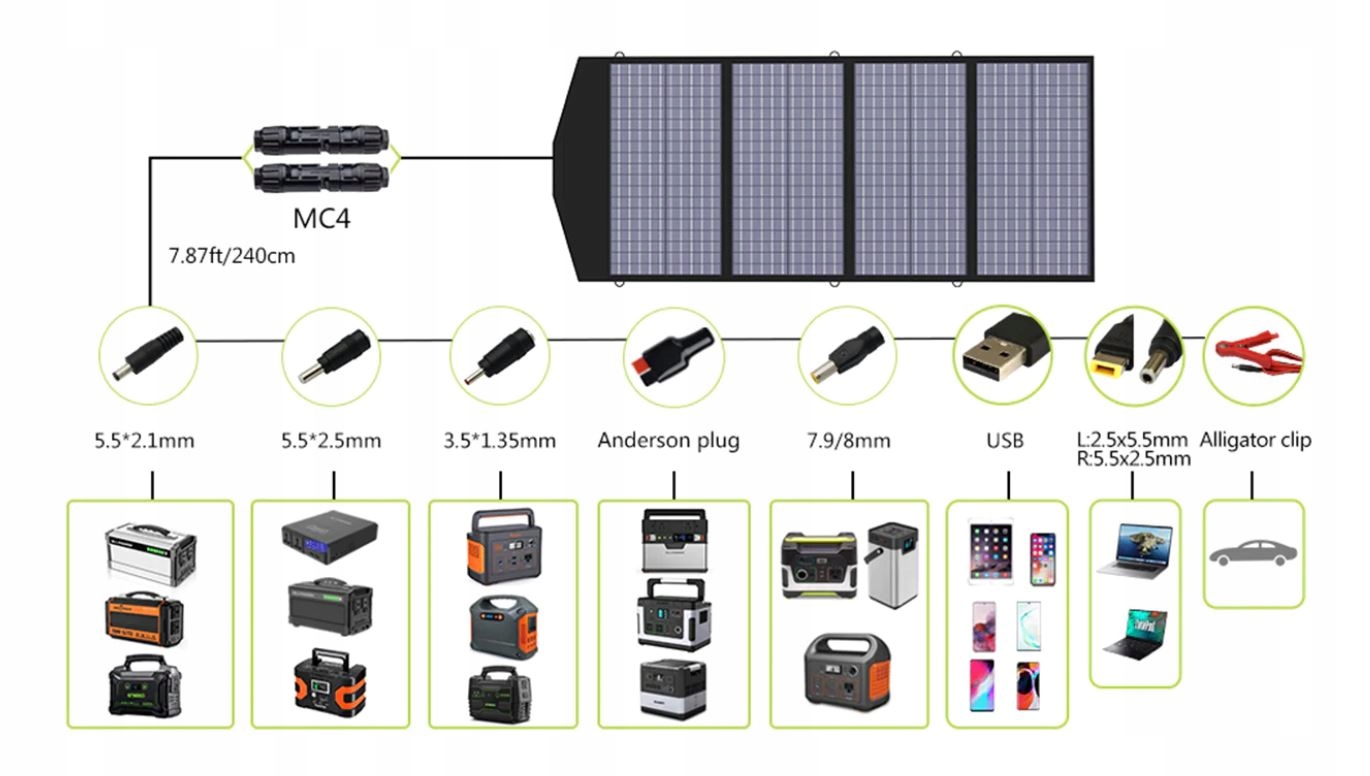 Allpowers AP-SP-029-BLA забезпечує доступ до MC-4 (макс. 25 A), постійного струму (10 A) і двох портів USB (кожен 5 В/2,4). Завдяки цьому ви можете заряджати невеликі електронні пристрої, ноутбуки, автомобільні акумулятори (12 В) або портативні генератори. Порт розподільної коробки дозволяє паралельно з’єднувати кілька панелей.