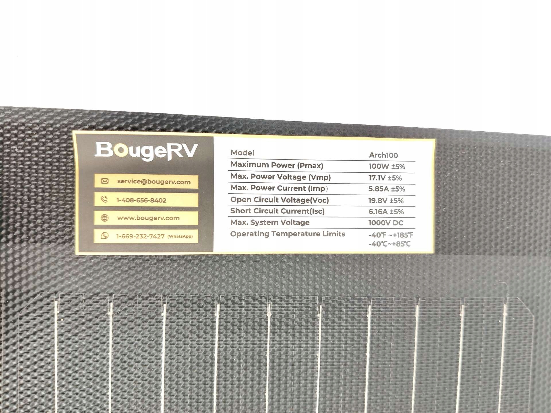 Гнучкість до 270° - подвійний захист зі скловолокна підвищує стійкість до ударів. Вам не доведеться турбуватися про тріщини. Подвійне скловолокно розміщене на верхньому та нижньому шарах моно сонячних модулів, щоб уникнути пошкодження клітин. Адаптується до більш вигнутих поверхонь і дозволяє встановлювати там, де жорсткі сонячні модулі не підходять. Повністю використовуйте обмежений простір на даху або навіть опуклій частині передньої частини автомобіля. Конструкція комірки 10BB і 23% найвищий коефіцієнт перетворення - більше шин, більше ефективності. Гнучкий скловолоконний сонячний модуль BougeRV потужністю 100 Вт використовує високоякісну конструкцію елемента 10BB з найвищим коефіцієнтом перетворення 23%. Це дозволяє гнучкій сонячній панелі мати довший термін служби. Збільште площу поглинання клітин, тонша стрічка зменшує площу покриття на 22%.