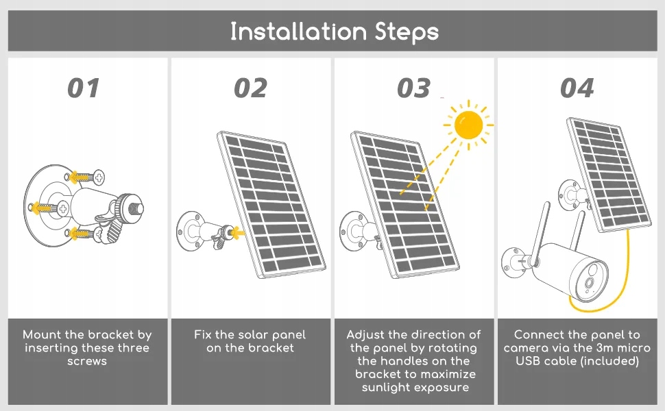 – 360-градусний настінний кронштейн дозволяє легко розмістити стійкі до погодних умов сонячні панелі для максимального освітлення сонцем.