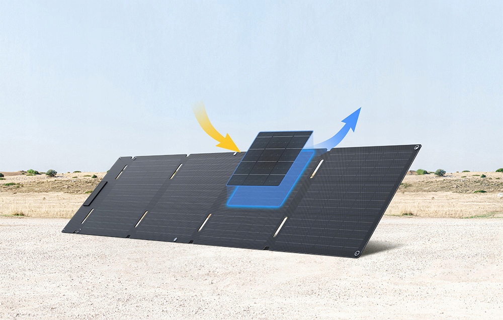 Корпус панелі виготовлений із шарів ETFE (етилентетрафторетилен - міцна фторполімерна плівка з високою стійкістю до ультрафіолетового випромінювання та погодних умов) і PCB (друкована плата - ламінована плата з провідним шаром, використовується в електроніці для стабільного складання компонентів), що гарантує стійкість до удари, вітер і контакт з водою. Сертифікація IP68 означає повний захист від пилу та стійкість до занурення у воду, що робить панель надійним супутником під час експедицій.