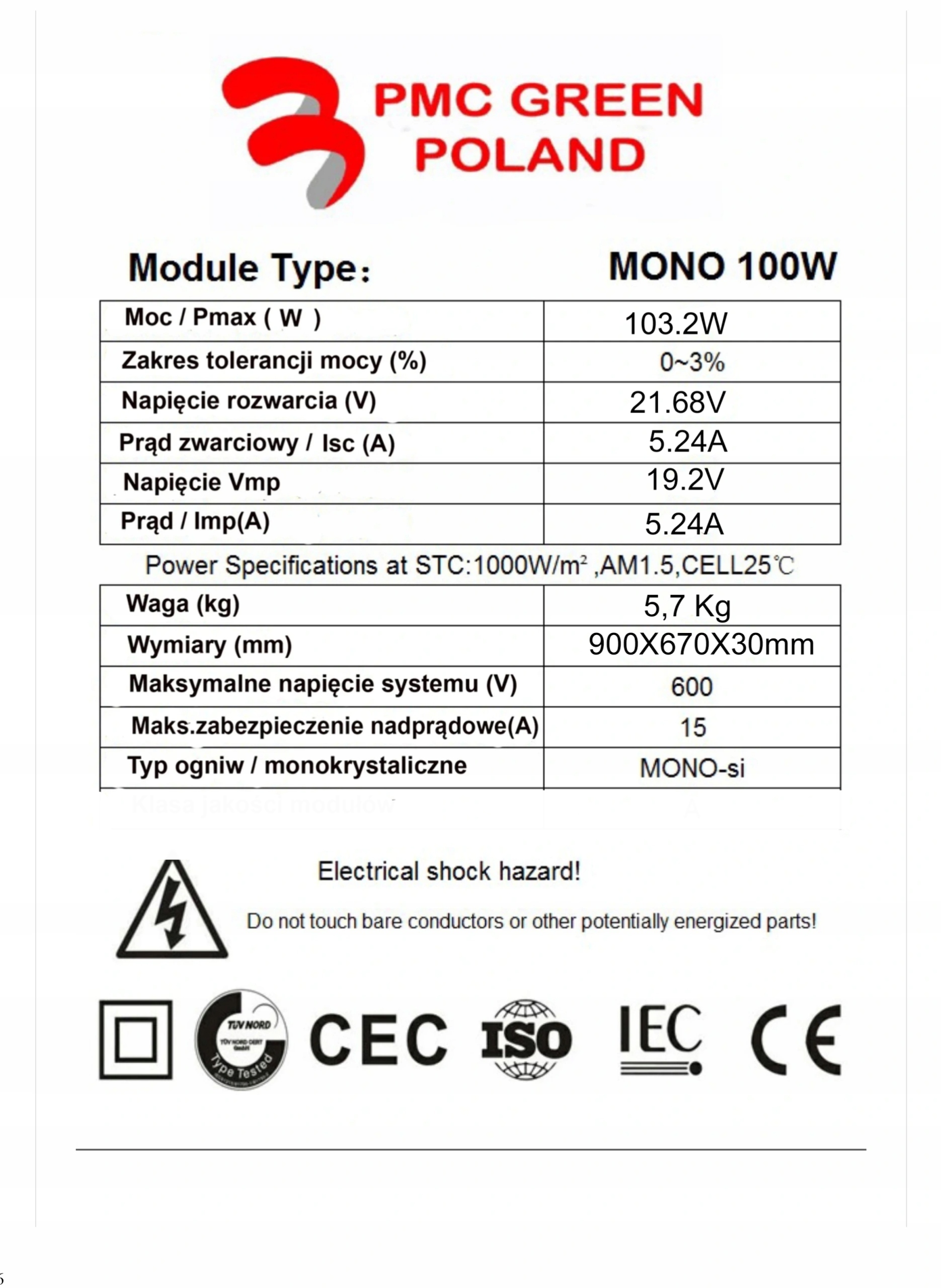 - Робоча напруга: 1,5кВ постійного струму, відповідає EN 50618 li>