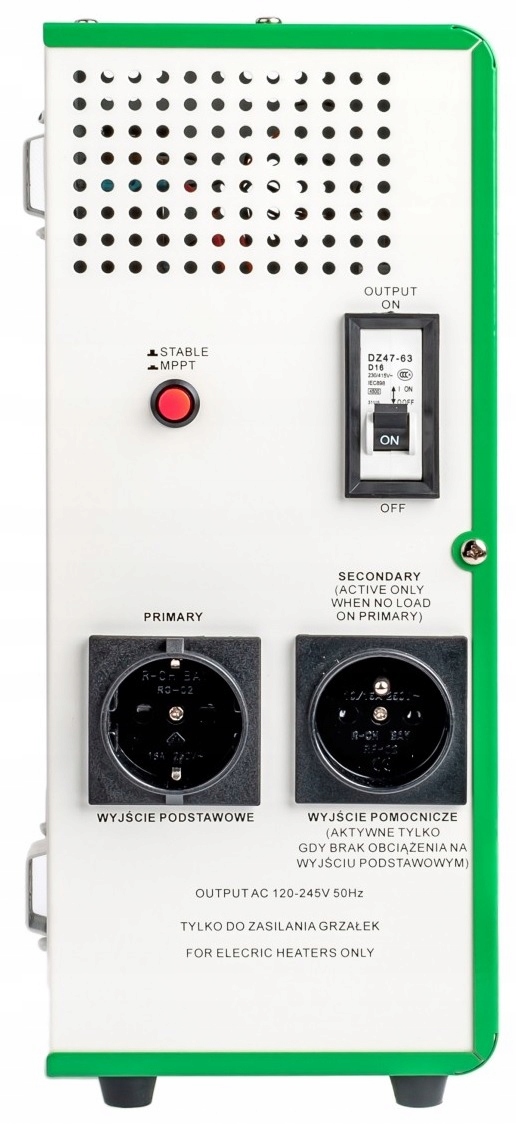 Dusty в даний час генерується на панелях, які неможливо безпосередньо живити при нагрівальних пристроях, він перетворюється в перетворювачі перетворений у змінний струм , який вже може живитися при нагрівальних пристроях. Пріоритет "1" , на якому завжди є напруга та залежний вихід "2" , який увімкнено, коли на виході немає першого, а другий у ситуації, коли термостат цього першого перерви отримає енергію з перетворювача. Завдяки реалізованій функції MPPT , перетворювач автоматично адаптується до потужності нагрівача та встановить свою робочу точку, щоб енергія, зібрана з системи сонячної панелі, становила максимальна .