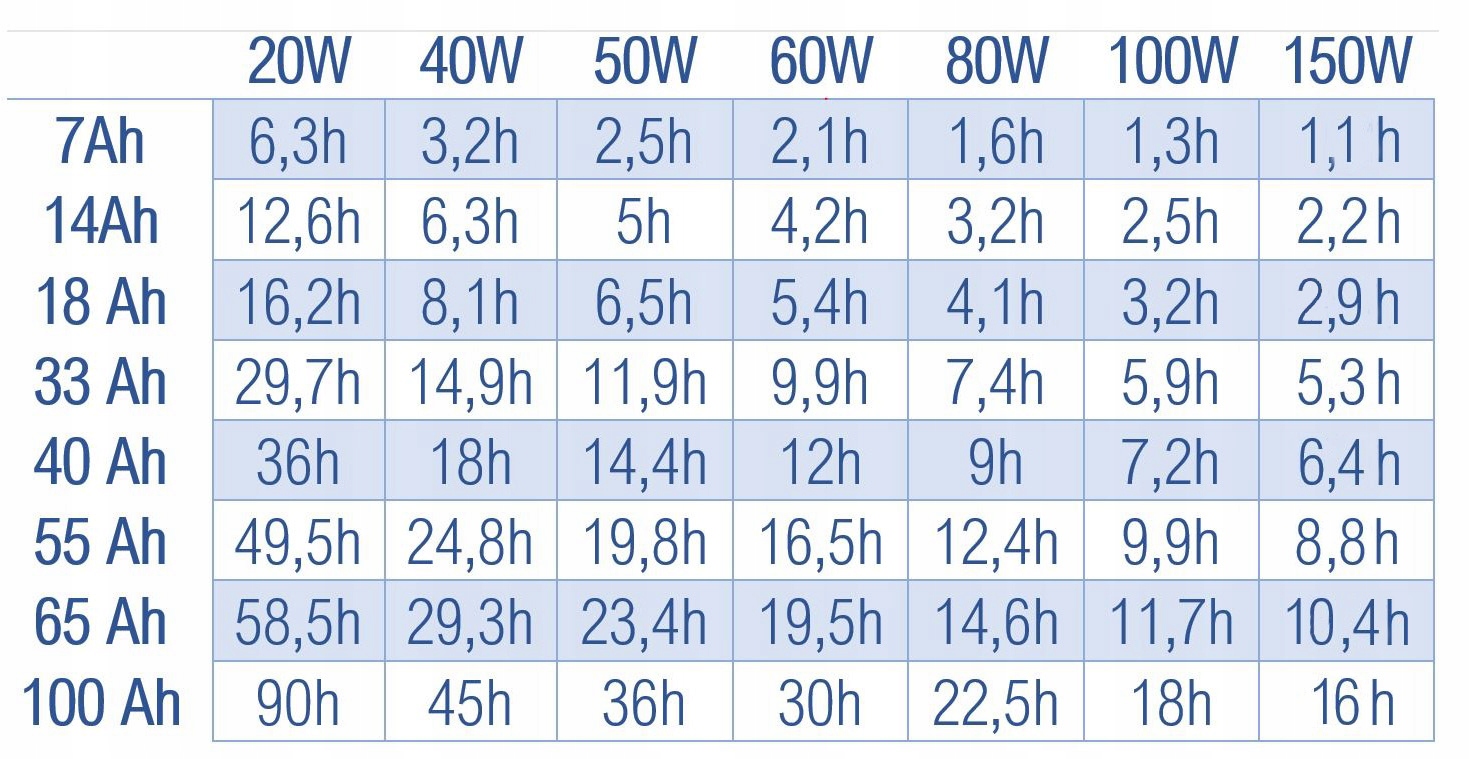 Таблиця, представлена поруч, представляє час, необхідний для зарядки акумулятора, доступного на ринку, залежно від потужності фотоелектричної системи.