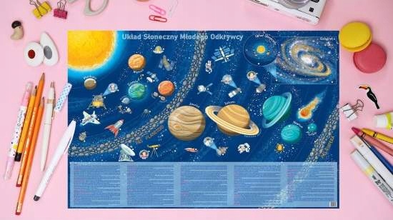 Інформацію про окремі елементи можна легко знайти завдяки цифровій легенді внизу карти; він включатиме не лише описи окремих планет, а й цікаві факти з історії відкриття космосу. Карта гармонійно поєднує в собі змістовну та візуальну сторони, що робить її ідеальним декоративним елементом дитячої кімнати. Сонячна система Юного дослідника – це карта, завдяки якій ви можете допомогти своїй дитині розвивати її захоплення та інтереси в цікавий спосіб.