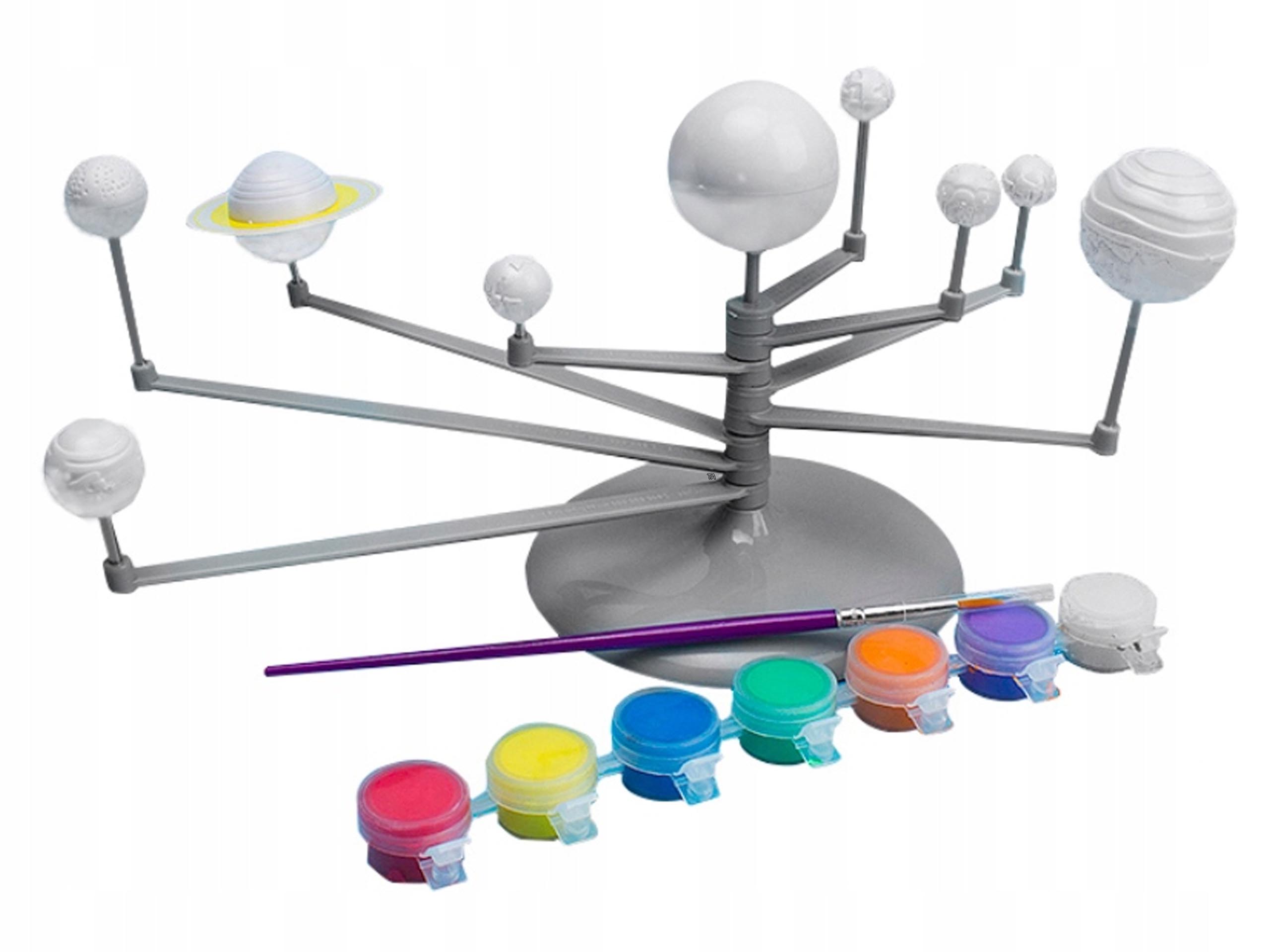 Цей унікальний набір дозволить вашій дитині самостійно створитисправжню модель нашої Сонячної системи. В іграшку входить: шаблон з 8 планетами, підставка, 7 кольорів фарби, пензликі маленький набір для збірки у вигляді металеві дроти, на яких кріпляться кульки. Її дуже легко та швидко зібратитому ваша дитина може зробити всю модель самостійно.