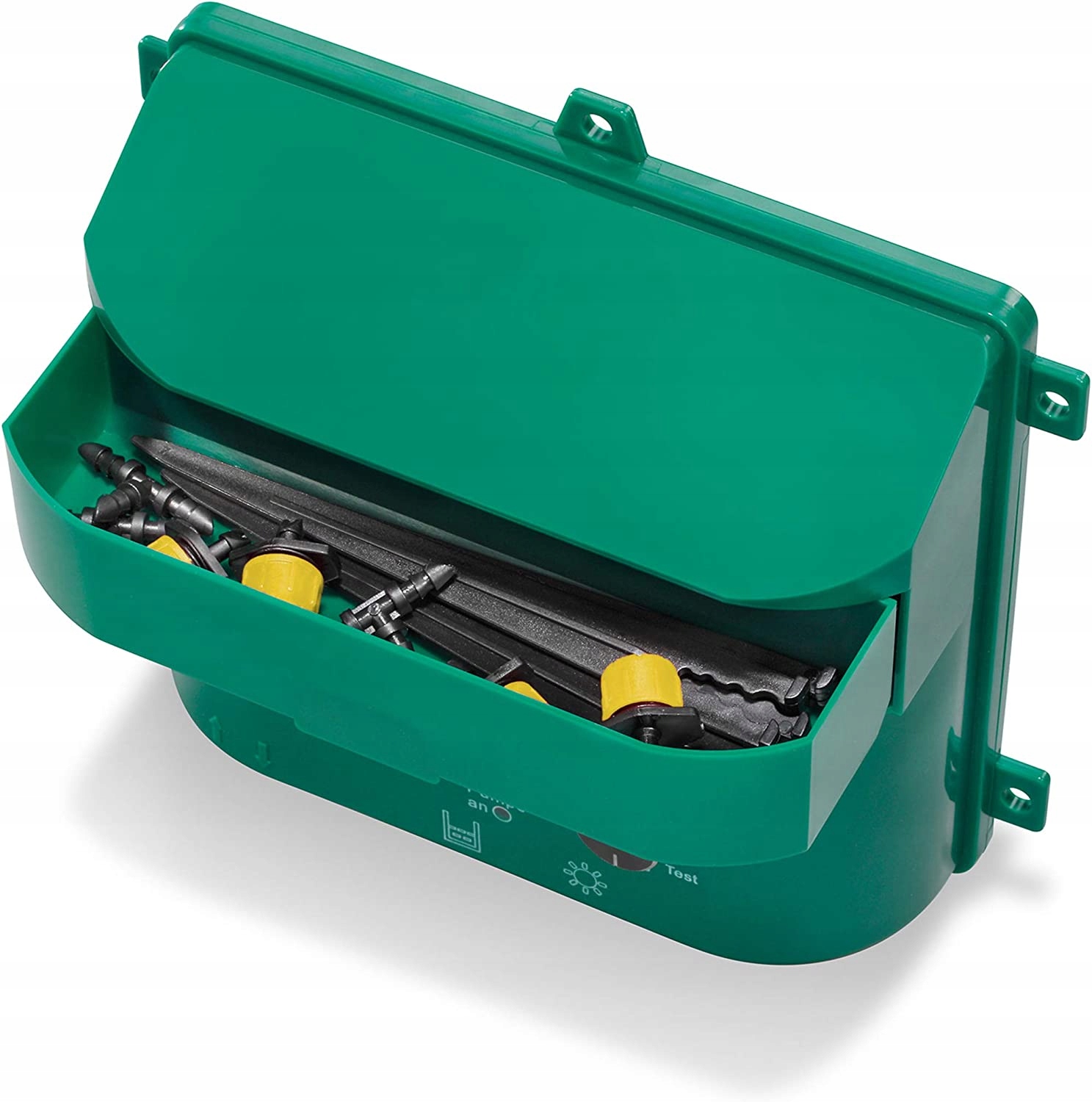 У компактному корпусі насоса системи зрошення рослин Esotec міститься не лише батарея та всі з’єднання, а й практичний ящик для аксесуарів. Вода всмоктується через металеве сито на кінці вхідного шланга.