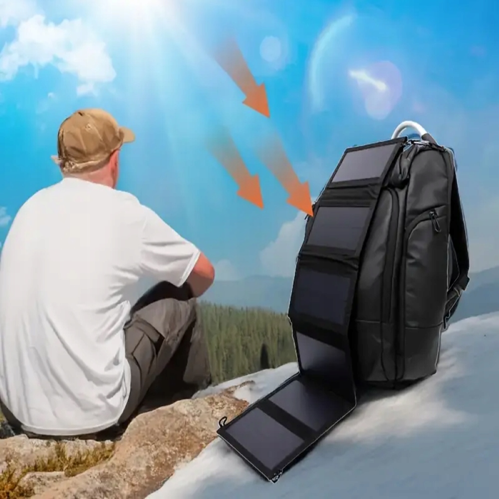 Панелі легко складаються для компактних розмірів. Після складання зарядний пристрій поміститься в бічну кишеню рюкзака або мішку для подорожей.