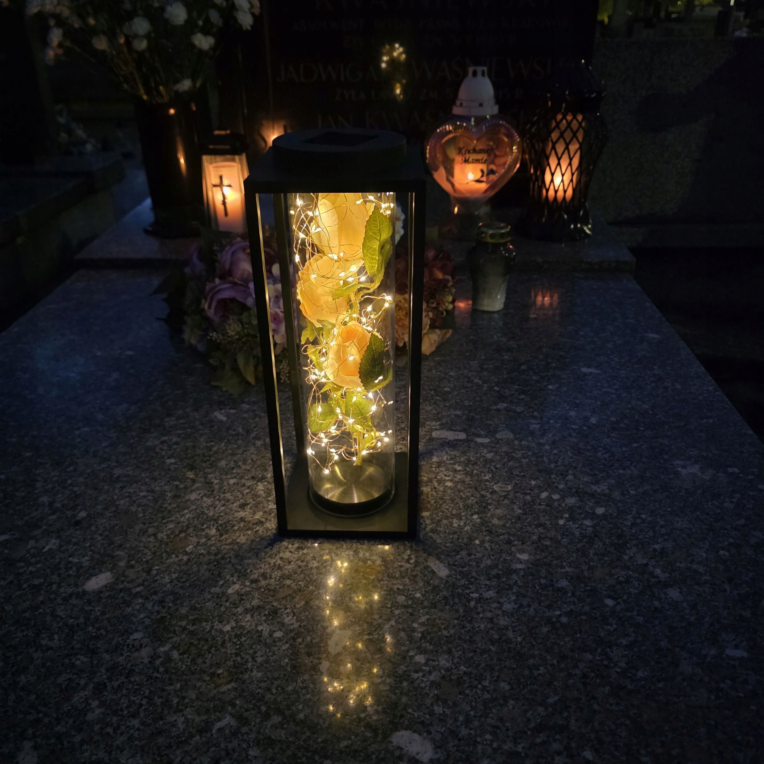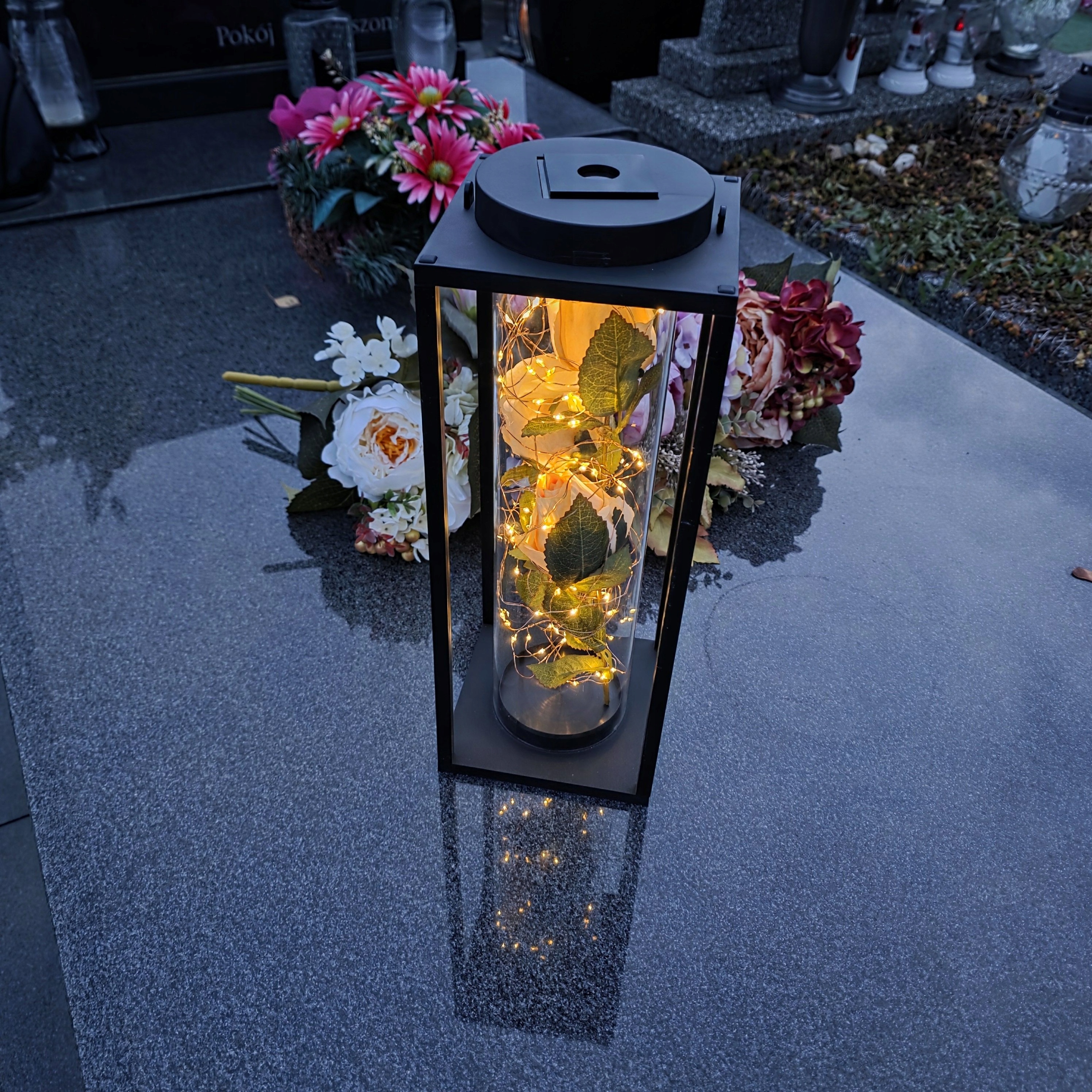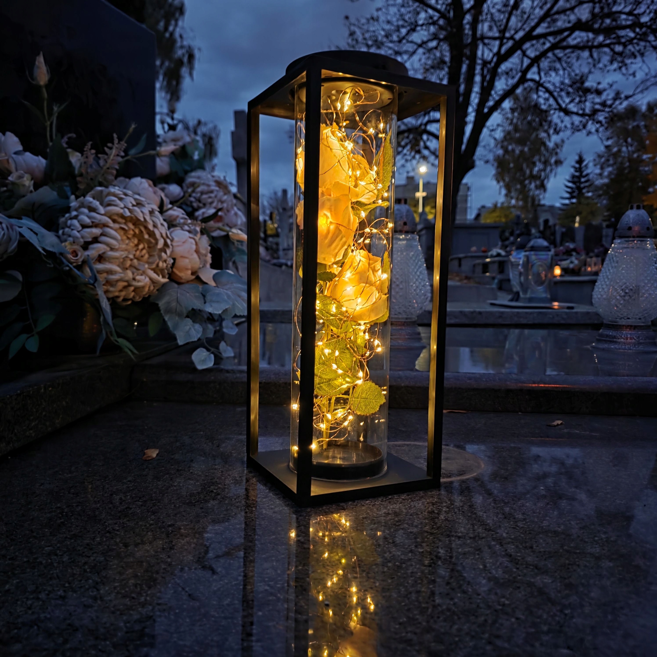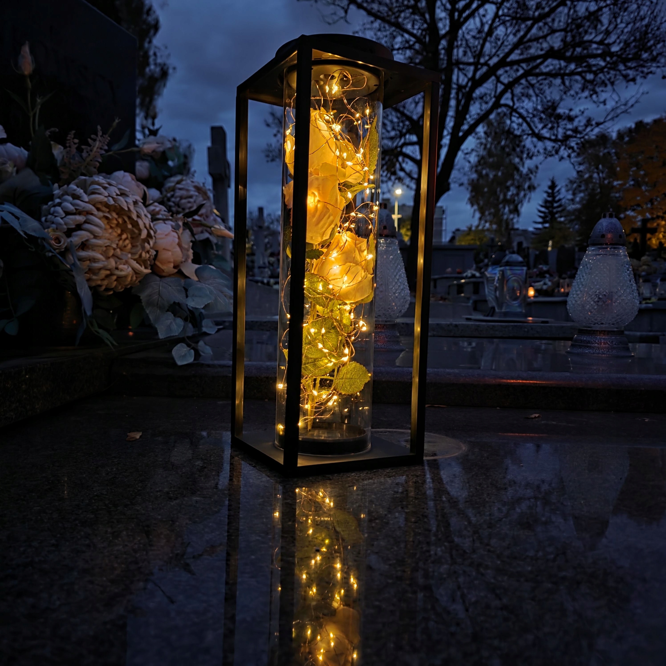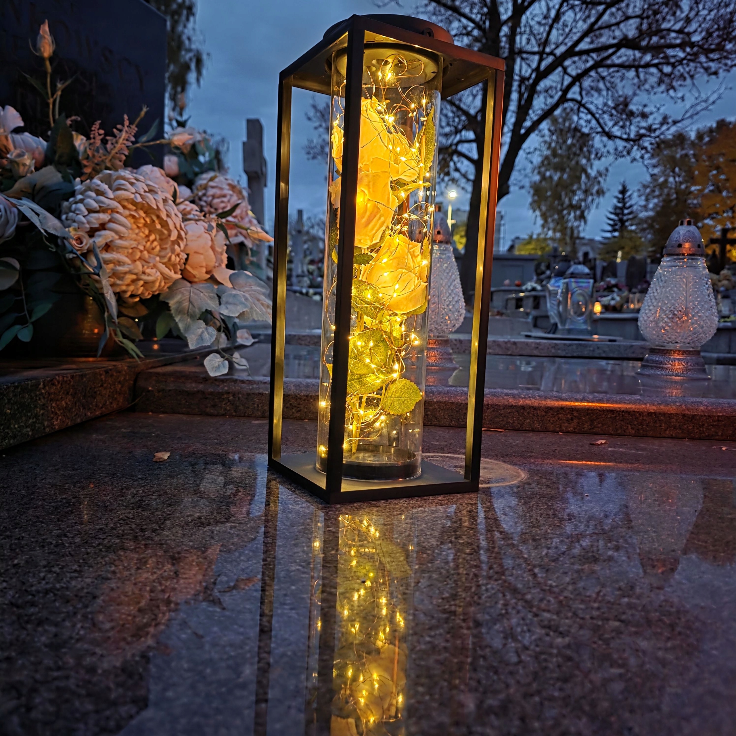 Ця незвичайна світлодіодна декоративна свічка - це поєднання сучасного дизайну, елегантності та символічної краси. Розроблений з увагою до кожної деталі, він є не лише виявом поваги до близьких, а й унікальною окрасою меморіального місця. Її тонке світло та квіткова композиція привертають увагу та створюють атмосферу, повну спокою та роздумів.