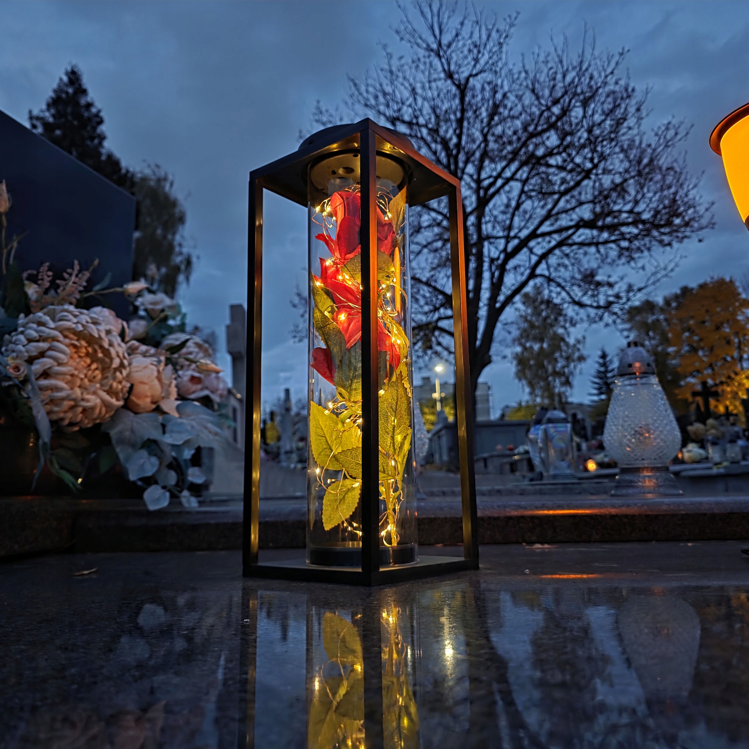 Ця незвичайна світлодіодна декоративна свічка - це поєднання сучасного дизайну, елегантності та символічної краси. Розроблений з увагою до кожної деталі, він є не лише виявом поваги до близьких, а й унікальною окрасою меморіального місця. Її тонке світло та квіткова композиція привертають увагу та створюють атмосферу, повну спокою та роздумів.