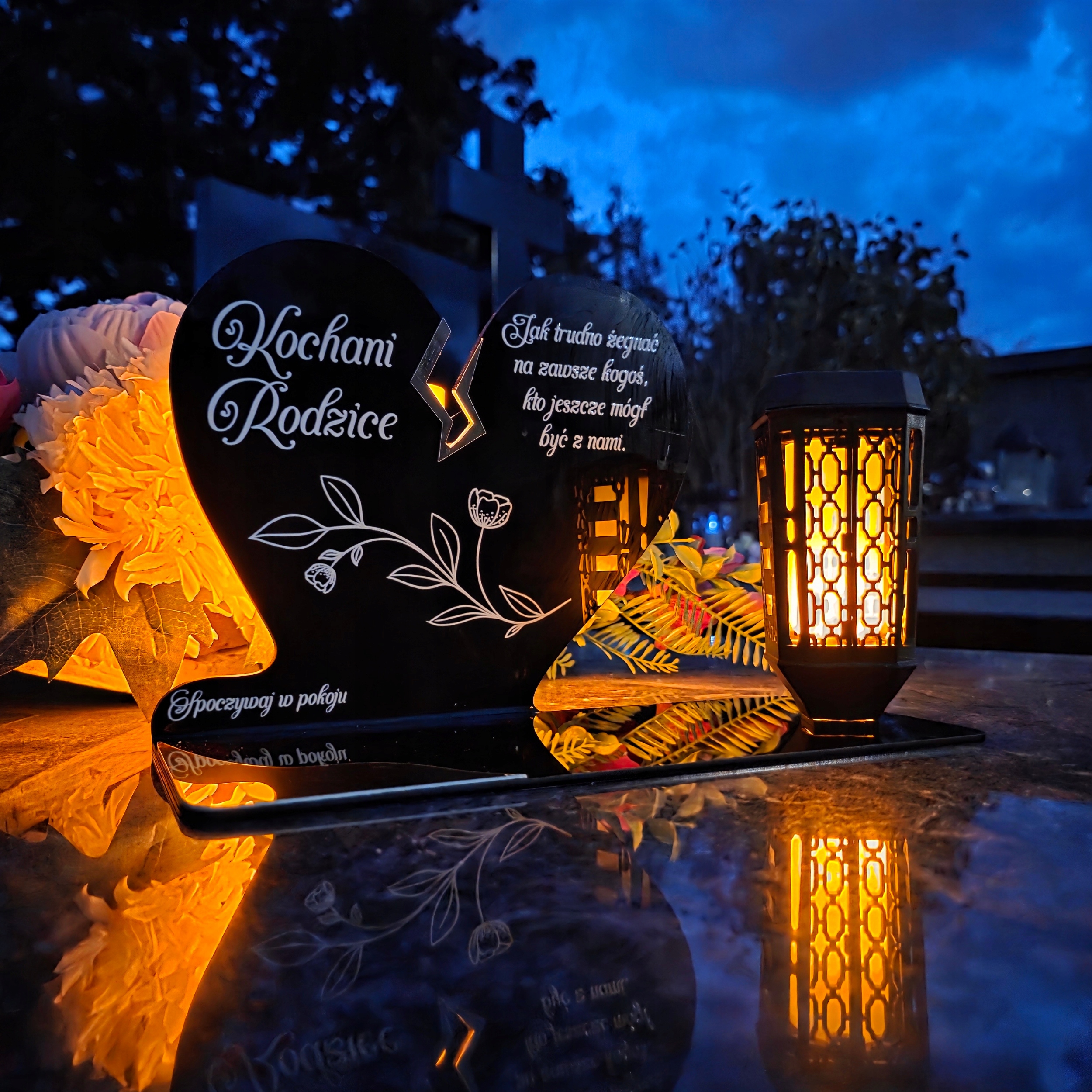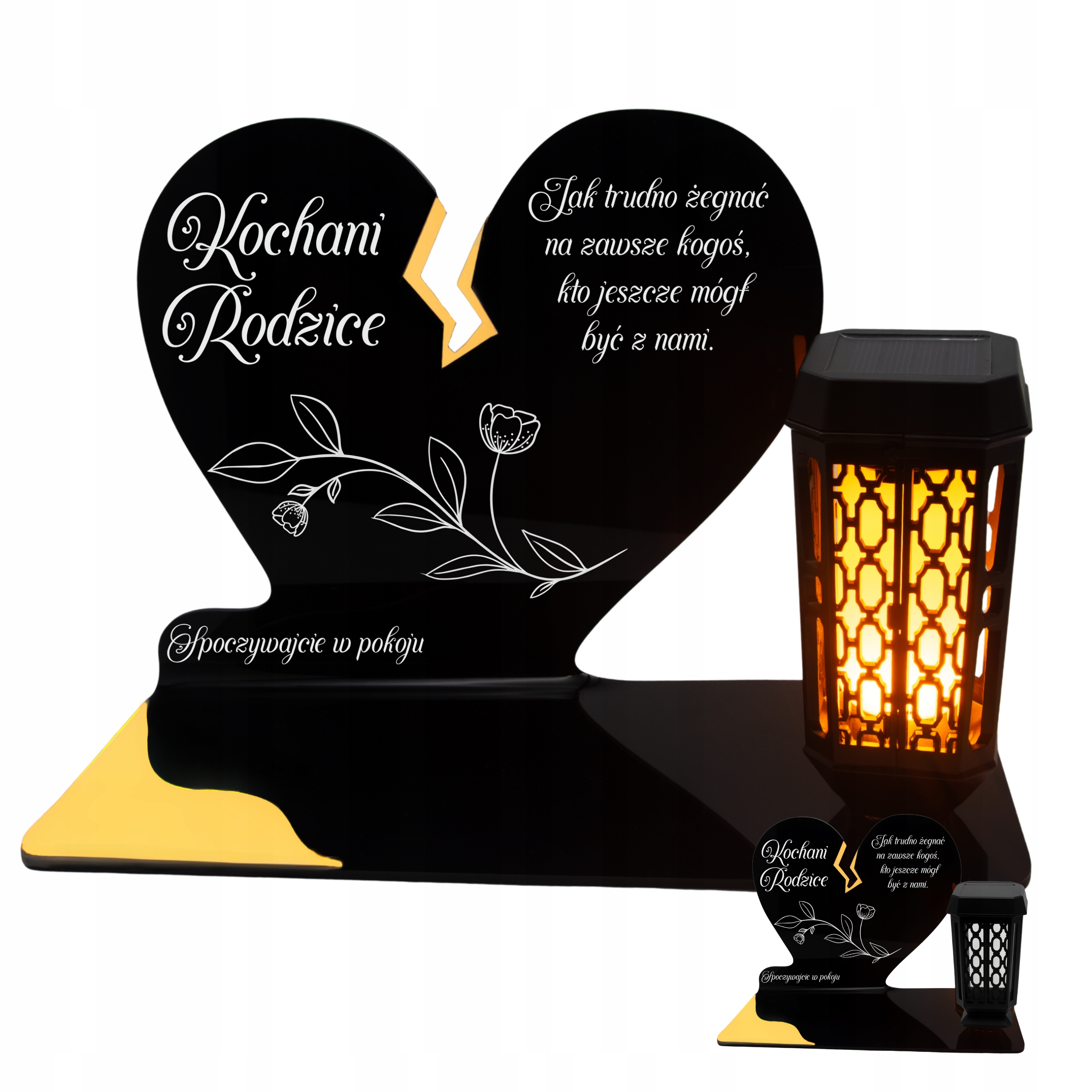 Ця унікальна надгробна свічка у вигляді чорного серця з тонкою золотистою тріщинкою - прекрасний символ любові та пам'яті, яка не згасає. Присвята «Шановним батькам» і тонкий квітковий мотив надають усьому зворушливого й елегантного характеру. Набір доповнено сучасною світлодіодною сонячною лампою, яка освітлює монумент теплим світлом після настання темряви, створюючи атмосферу роздуми та спокою.