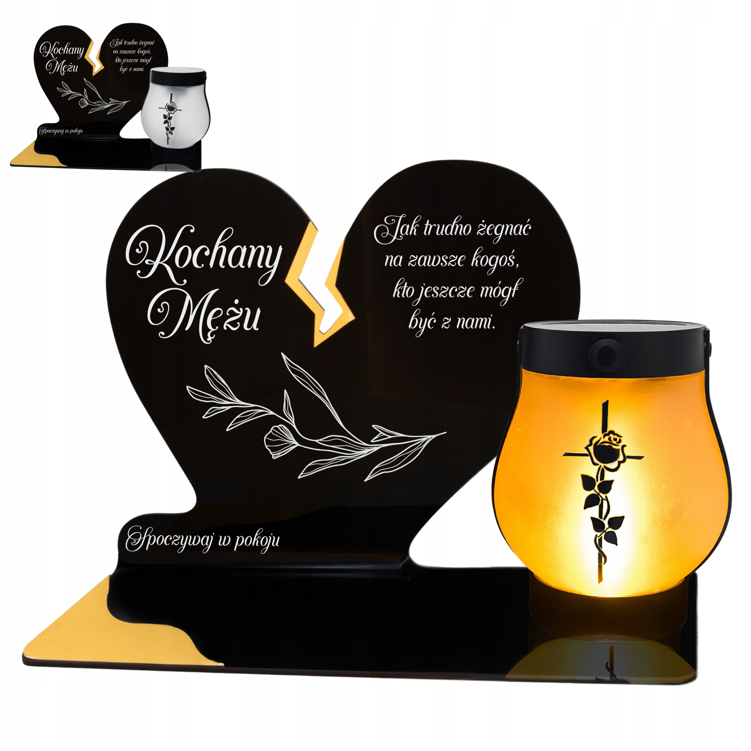 Унікальна надгробна свічка у вигляді чорного серця з ніжною золотистою тріщинкою є символом любові, пам'яті та поваги. Елегантна форма в поєднанні з сучасною світлодіодною лампою на сонячних батареях створює композицію, яка освітлює монумент теплим бурштиновим світлом після настання темряви. Лампа має два режими освітлення (ефект полум'я або постійне світло), а також працює після зарядки USB-C.