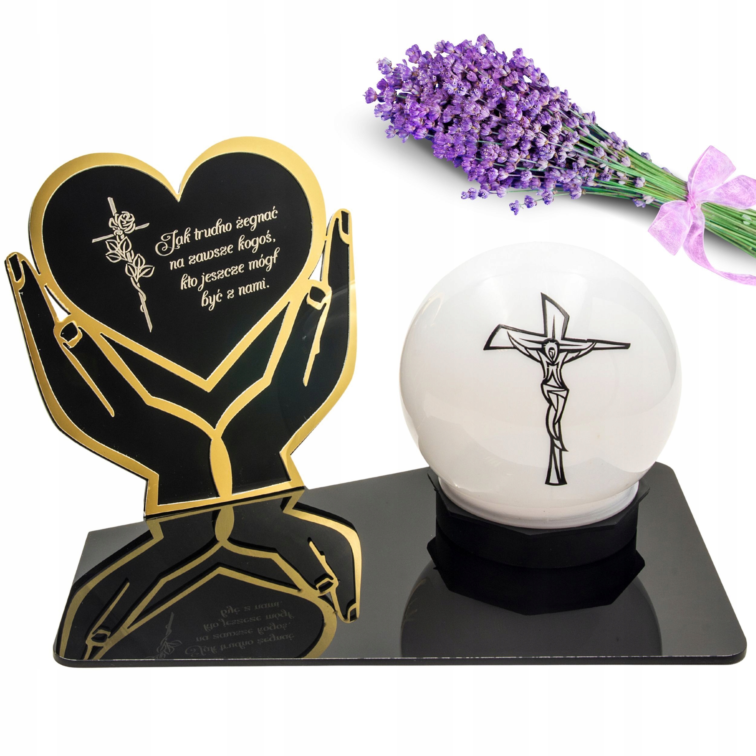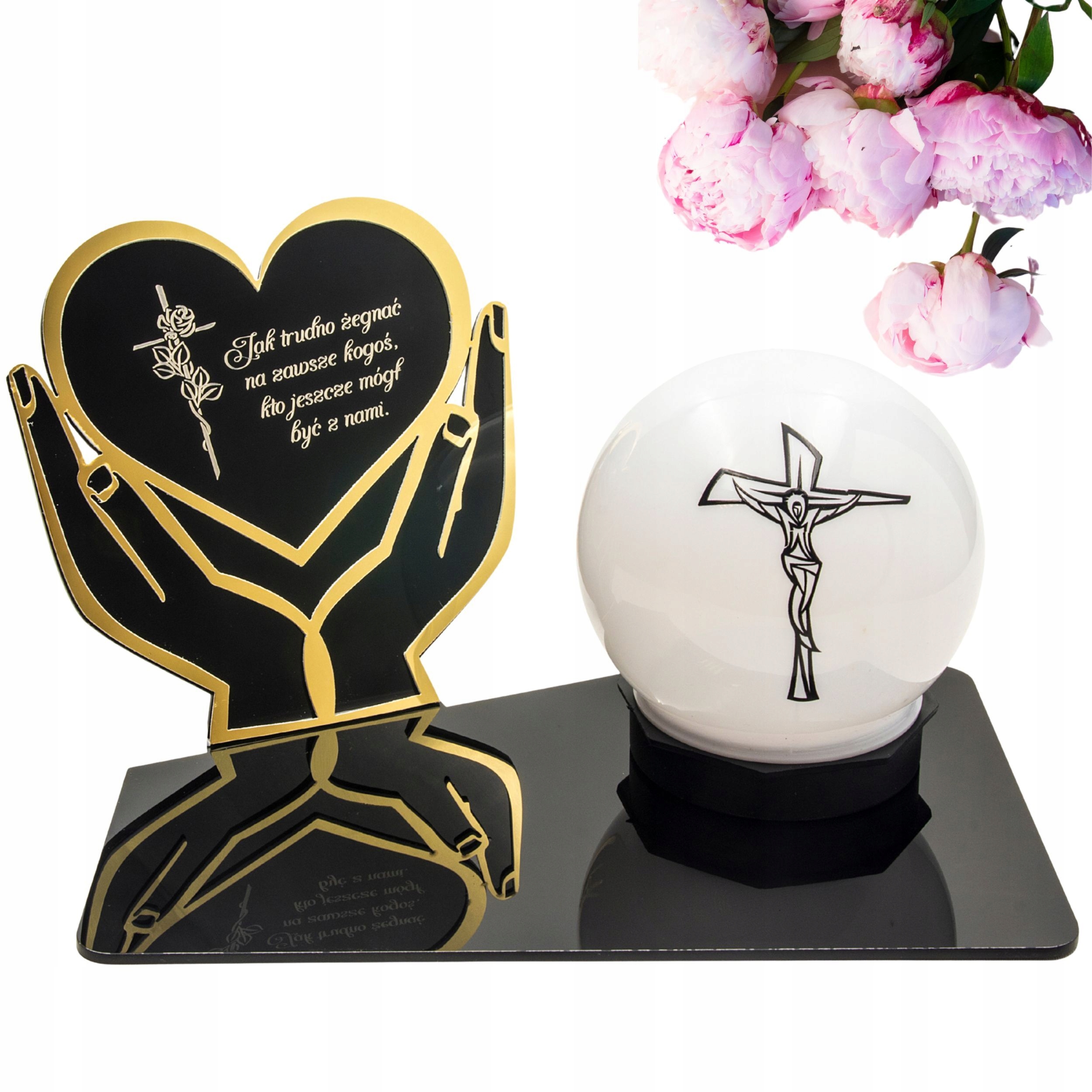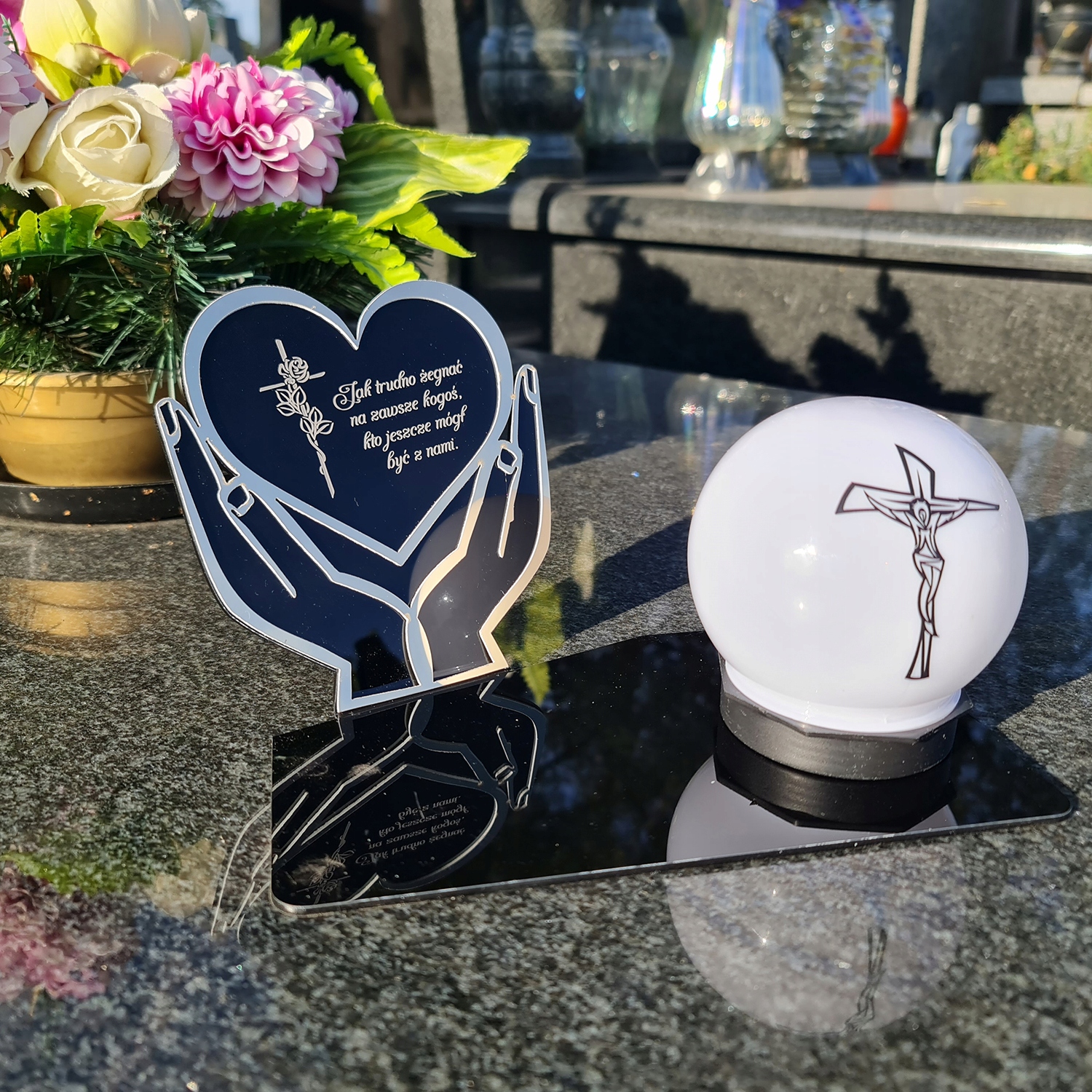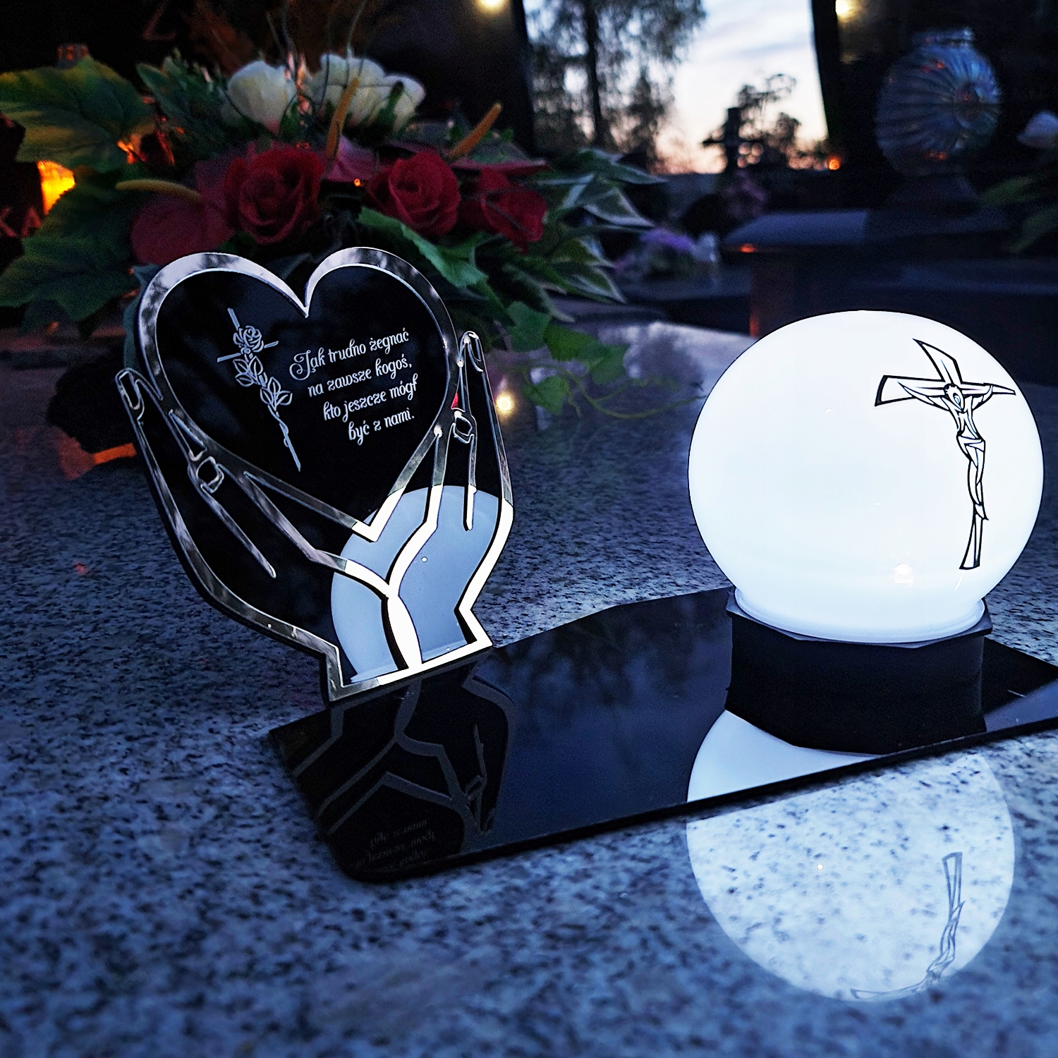 ВІЧНА СОНЯЧНА ГРАВІЙНА СВІЧКА З ГРАВІЮВАННЯМ НА ПІДСТАВЦІ З АКРИЛОВОГО СКЛА, ПРИКРОШЕНА МОТИВОМ ЗОЛОТИХ РУК ІЗ СЕРЦЕМ