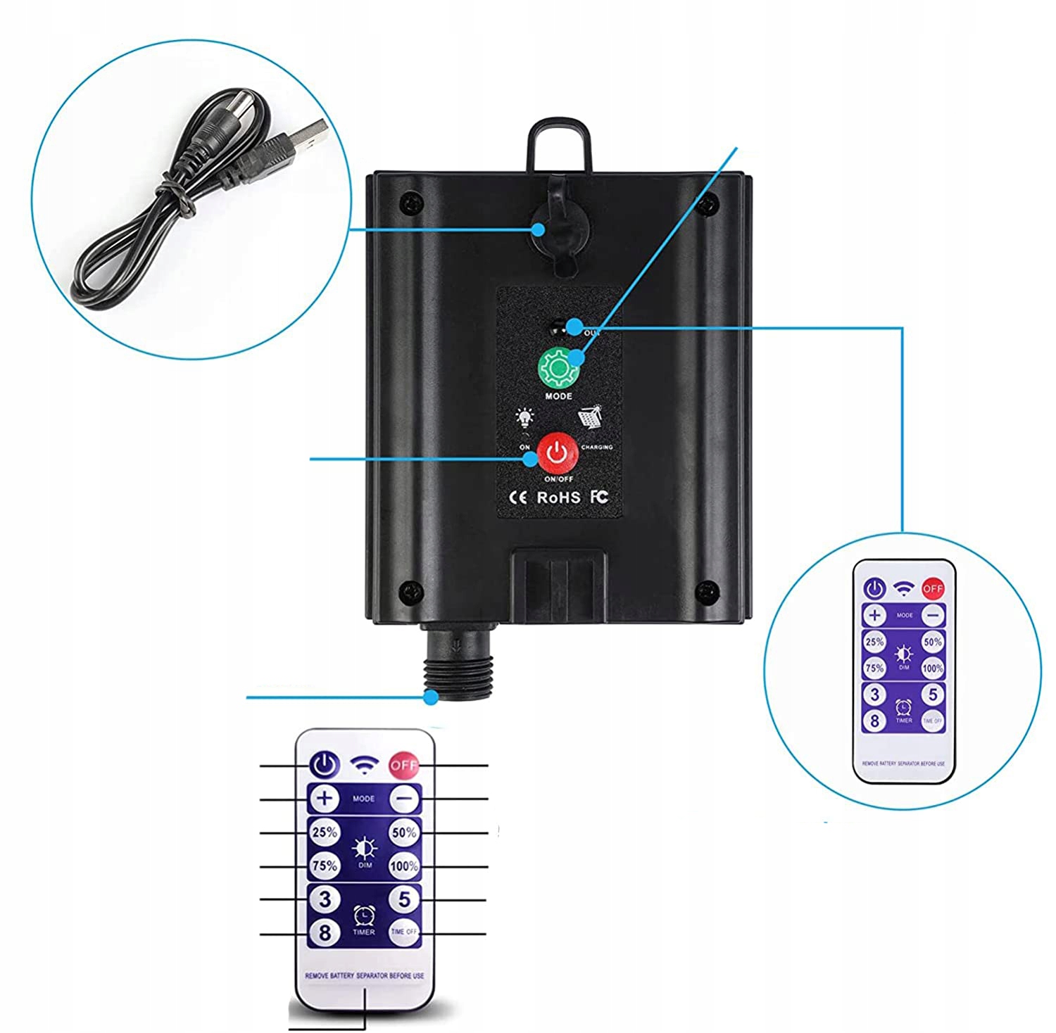 Світлоподібні ліхтарі з дистанційним керуванням дозволяють змінювати 8 режимів освітлення, регулювати яскравість і встановлювати таймери, а також умикати/вимикати. 8 режимів освітлення (комбінація, хвиля, послідовність, SLO GLO, гонитва/спалах, повільне згасання, миготіння/блимання, постійне)