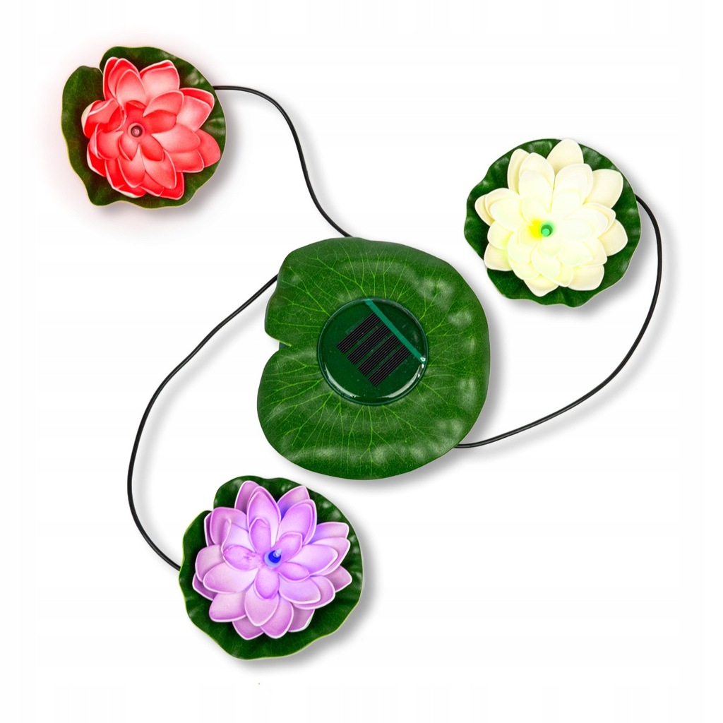 Світлодіодна водяна лілія - це набір з трьох плаваючих квітів, оснащених барвистими світлодіодами, а також листя, на якому встановлена сонячна панель. Продукт є водонепроникним, тому його можна використовувати як прикраса поверхні ставка. Шрифт 12,7 см, головна з сонячною панеллю 18,0 см